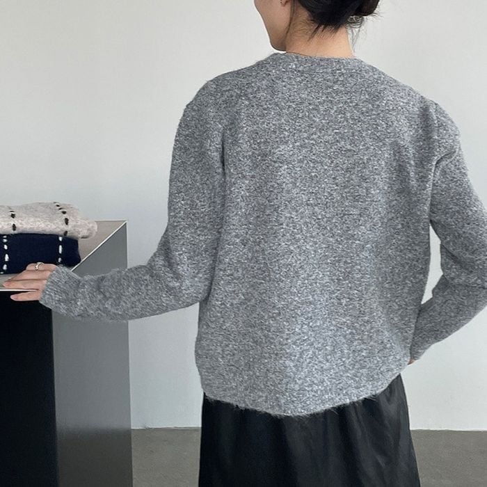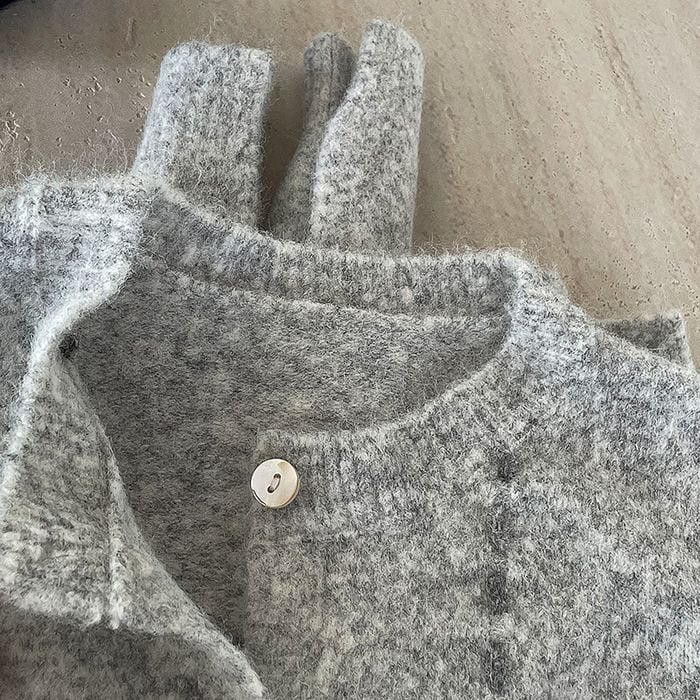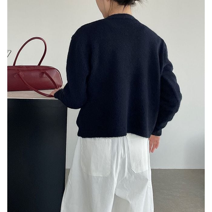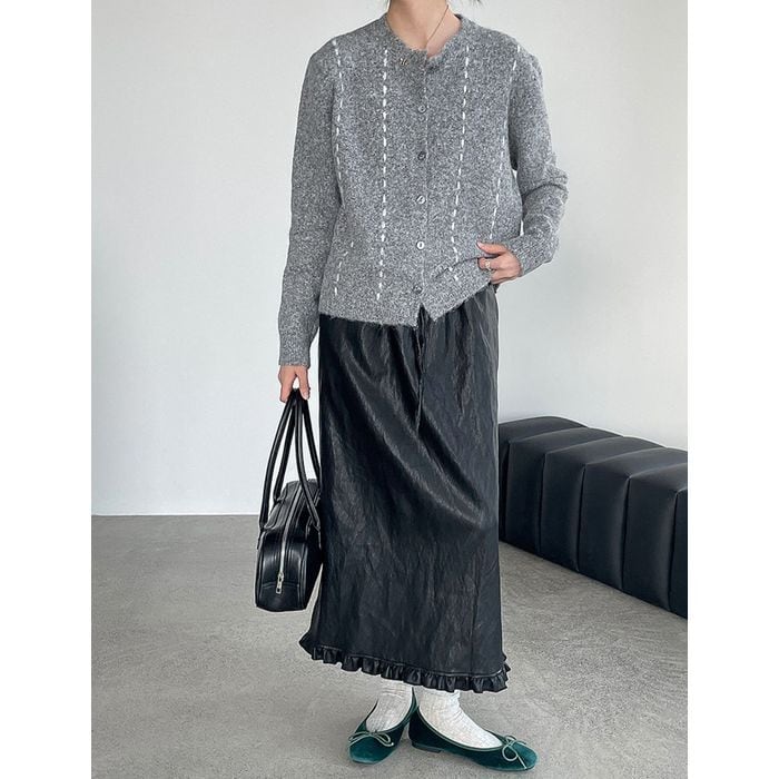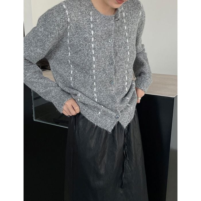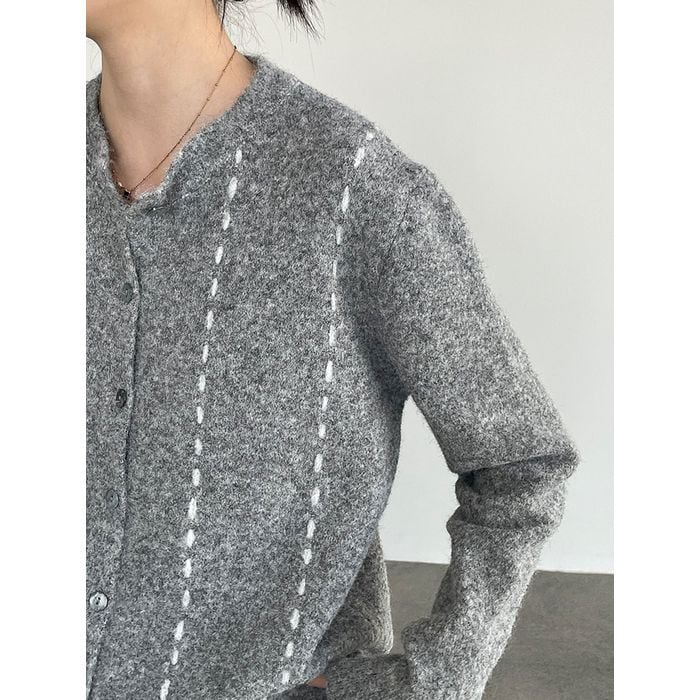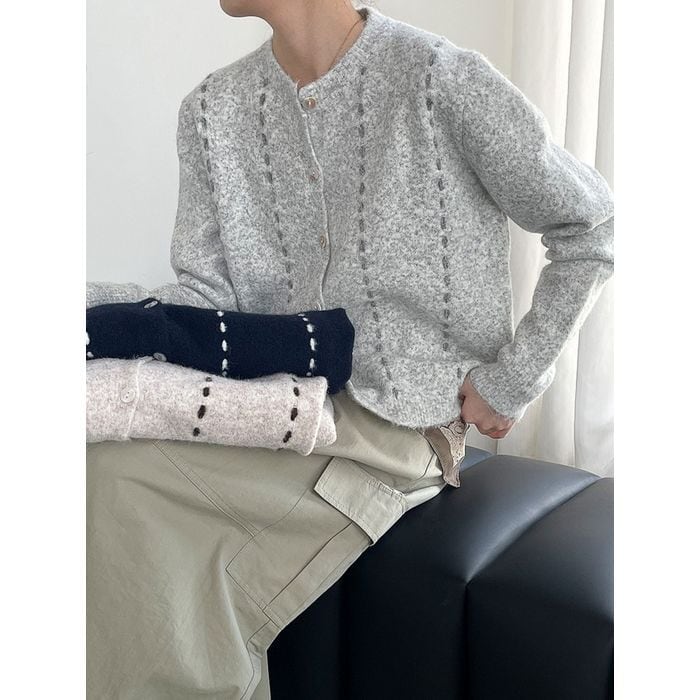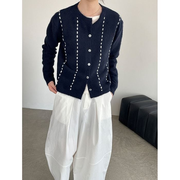 コントラストのある縦線刺繍が魅力のニットカーディガン。