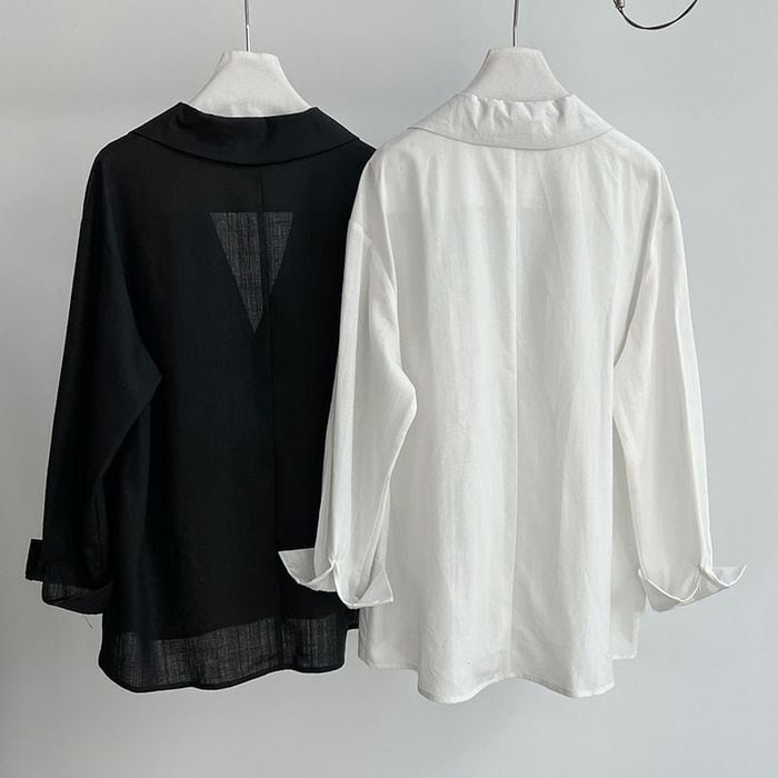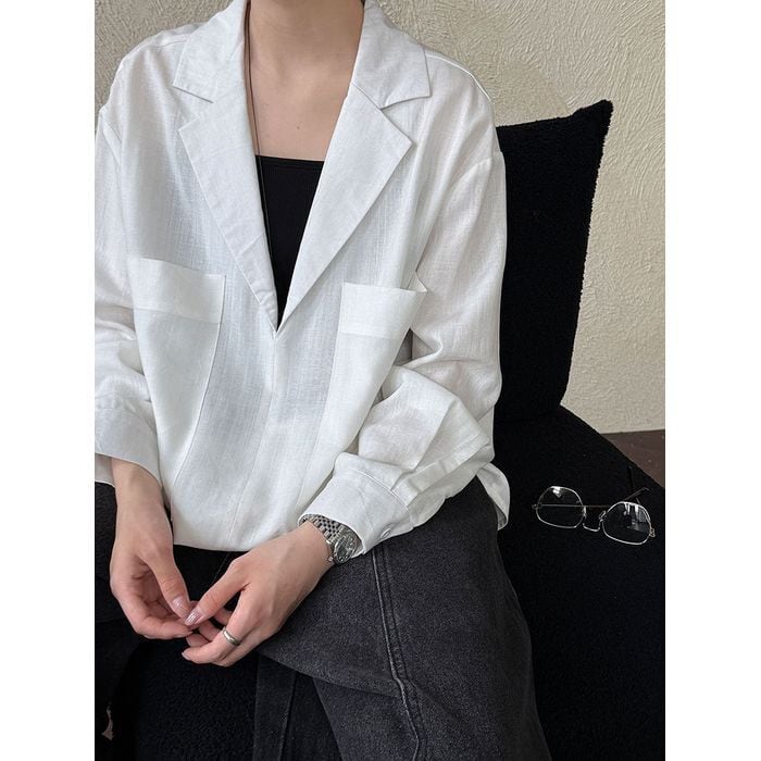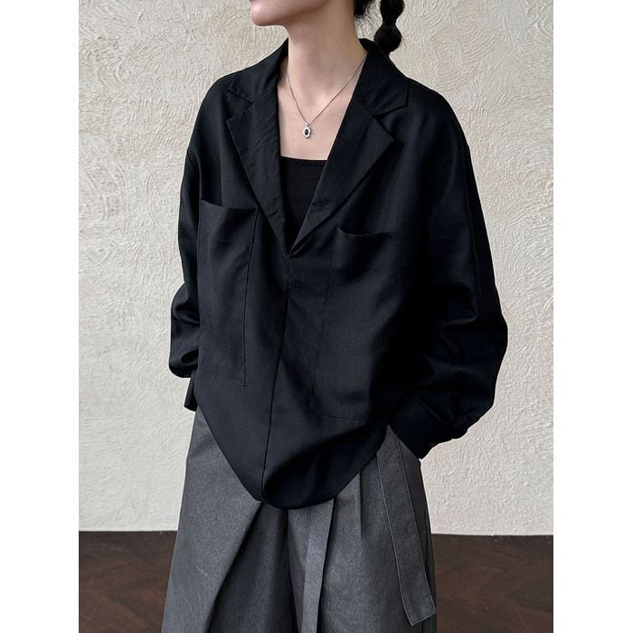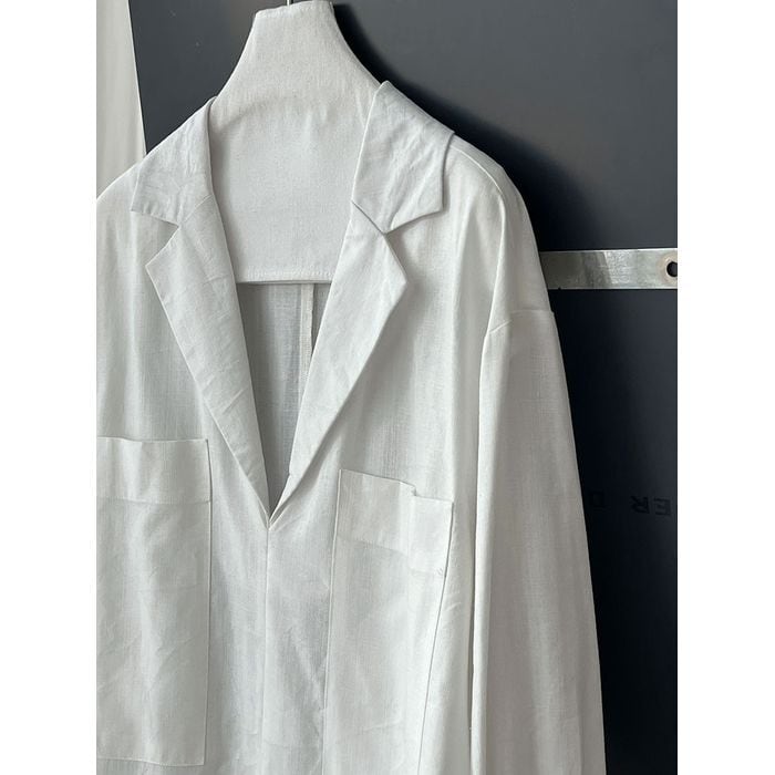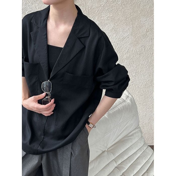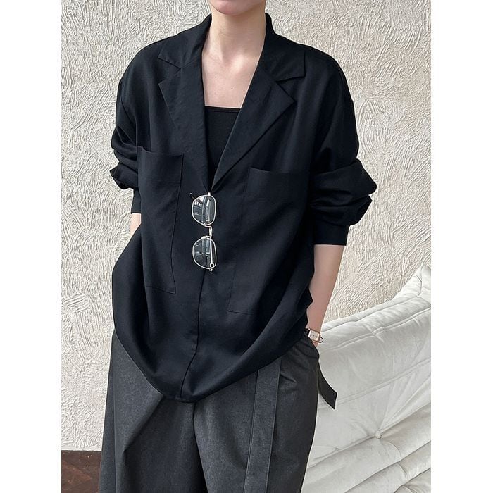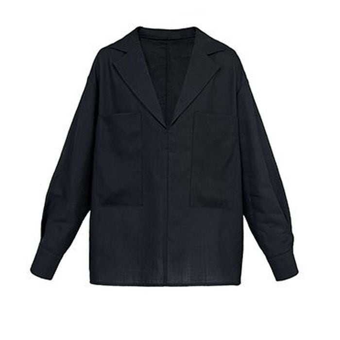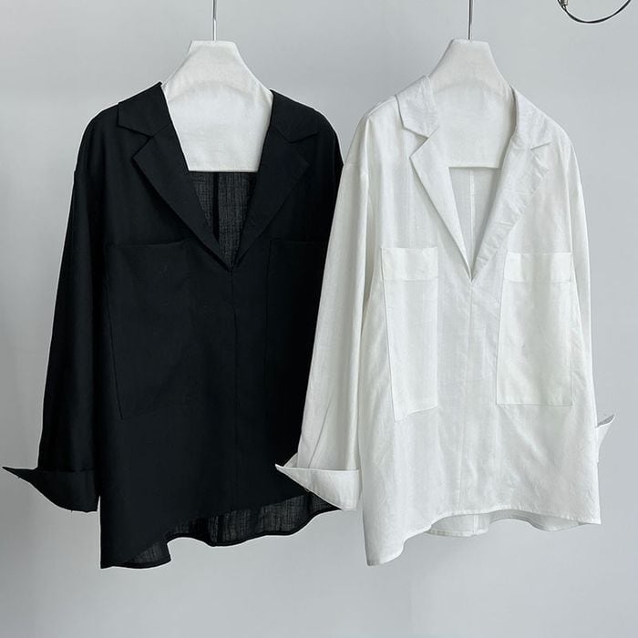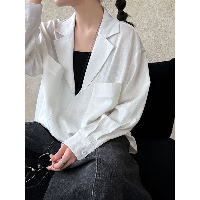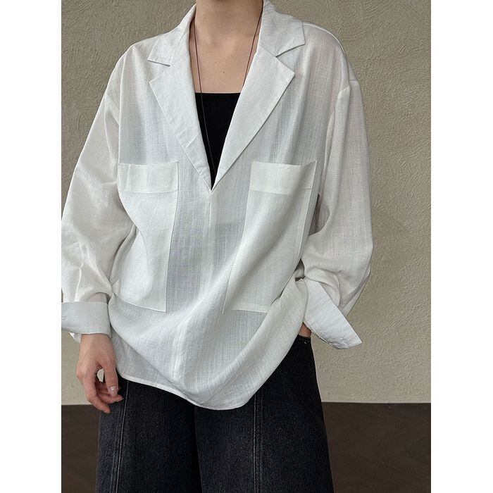 深めのVネックデザインと両脇のポケットが特徴のシャツ。