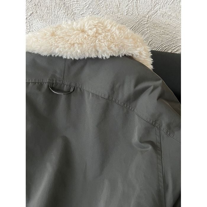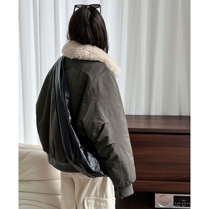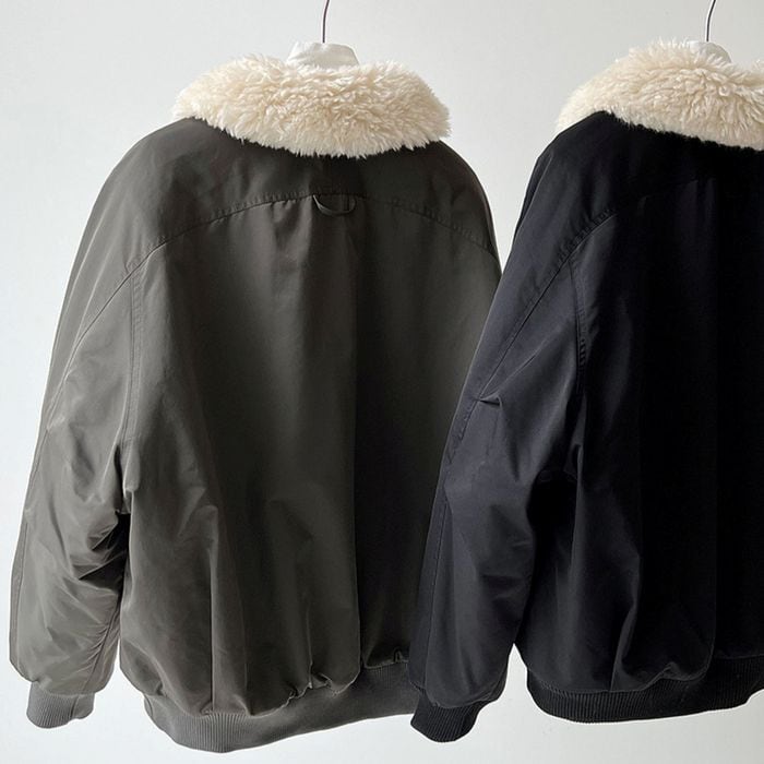 ふわふわとした襟が目を引くジップアップジャケット。
