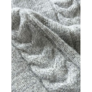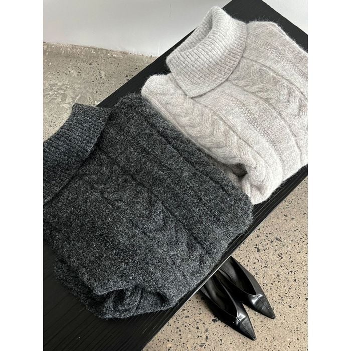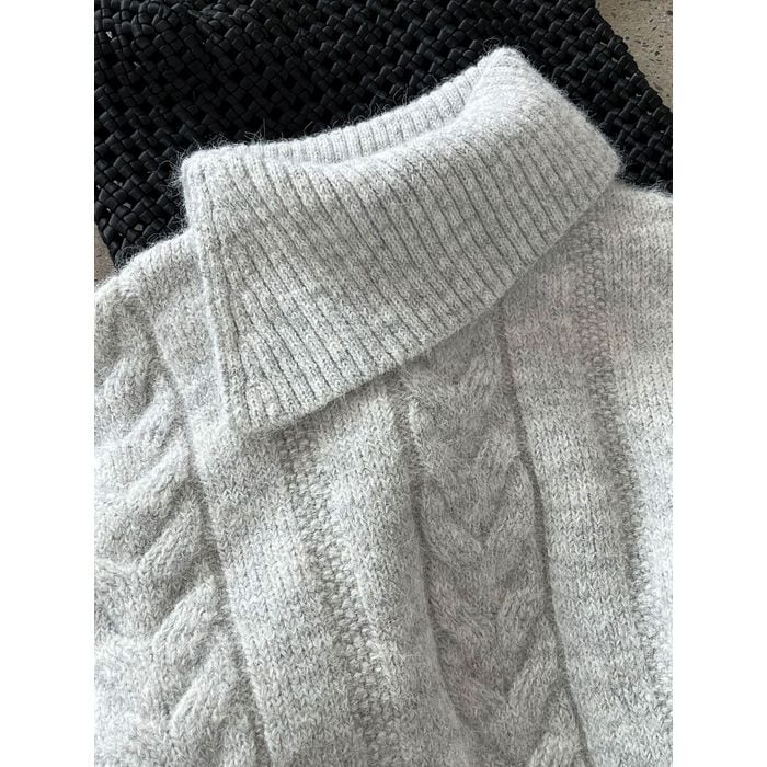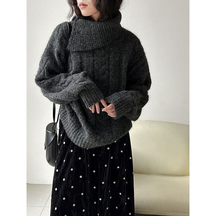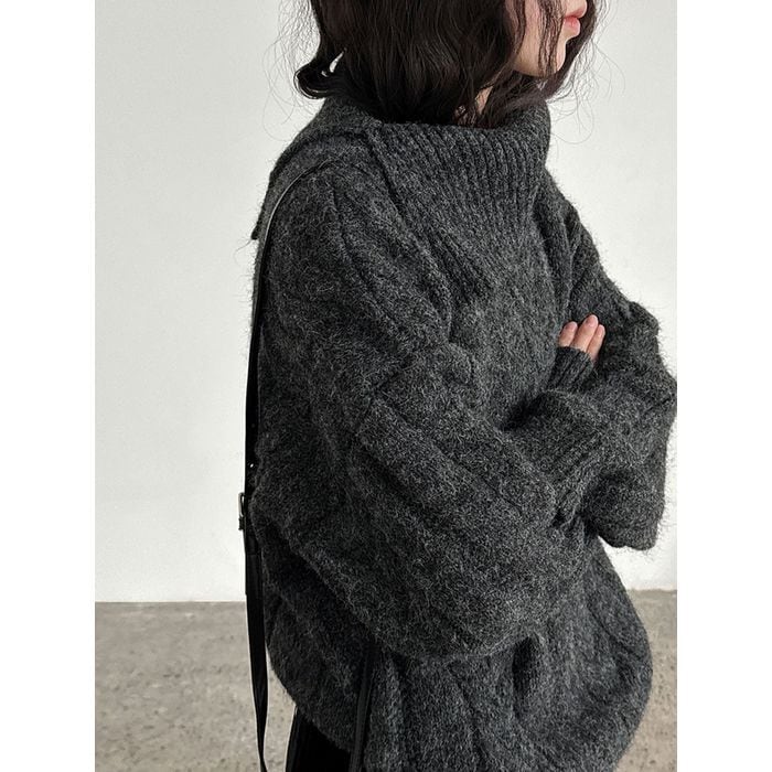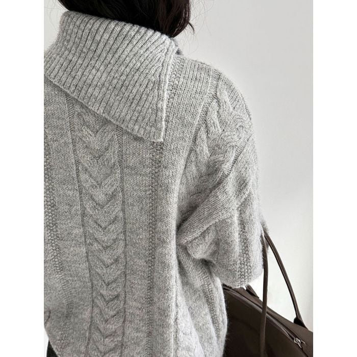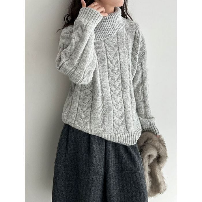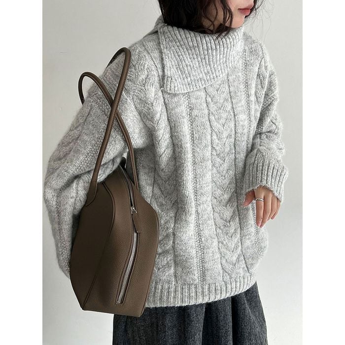 アシンメトリーなハイネックが魅力のケーブルニット。