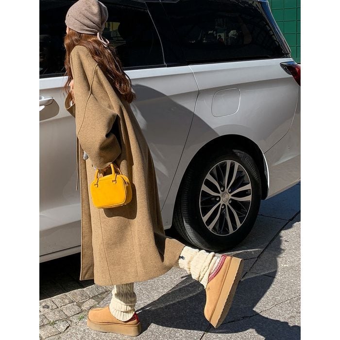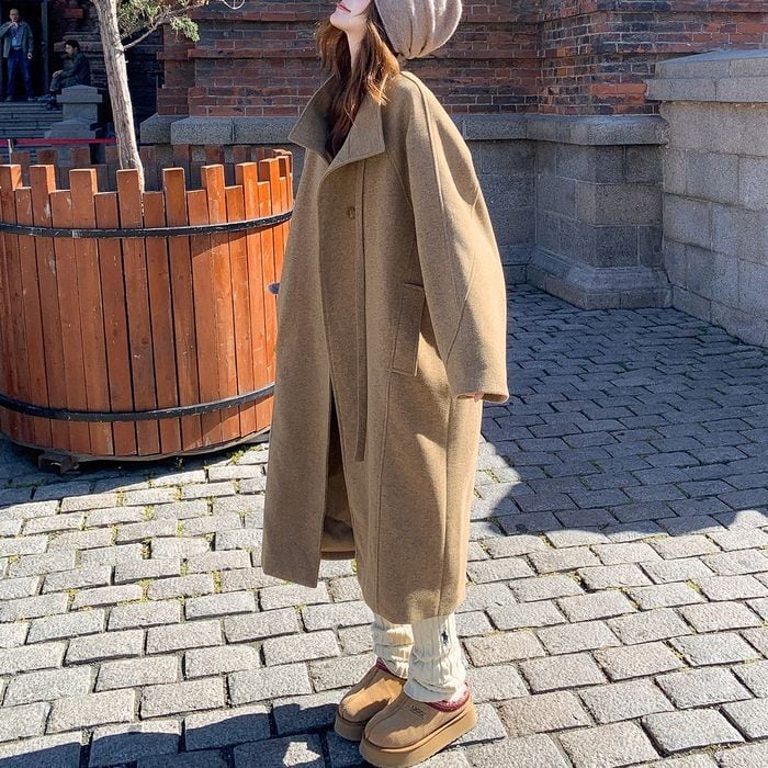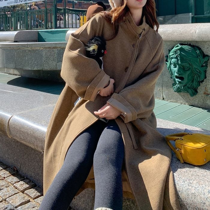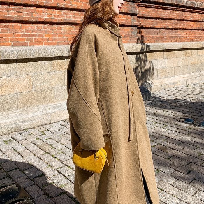 首元に同布のベルトが付いたロングコート。