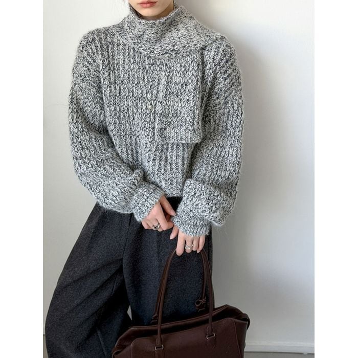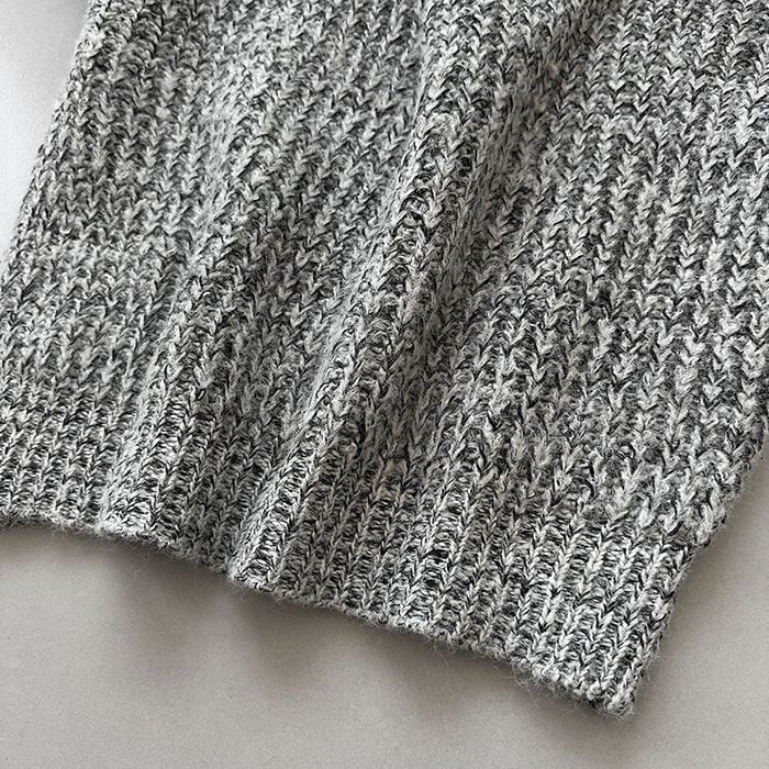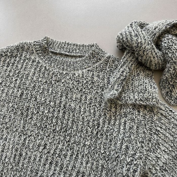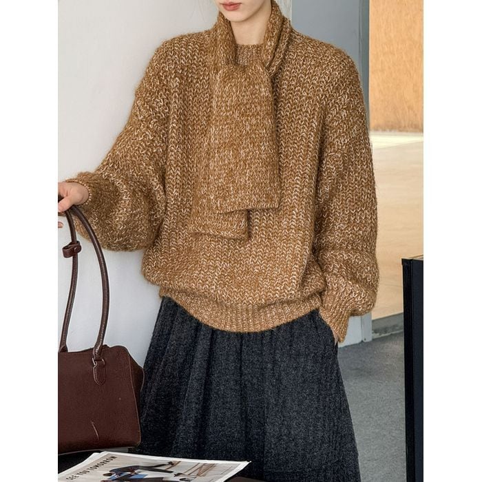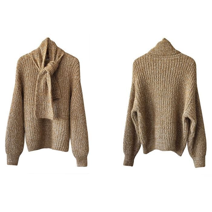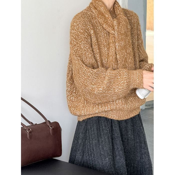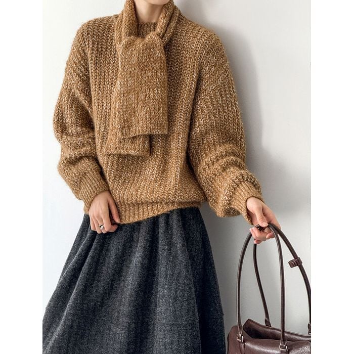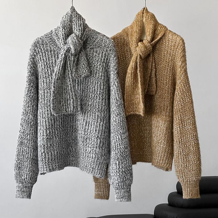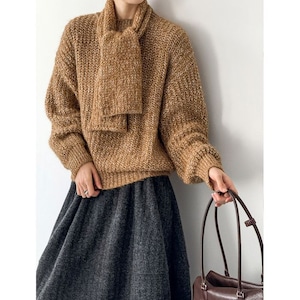 ニュアンスカラーのニットトップスとマフラーのセット。