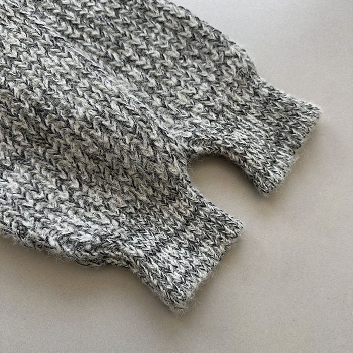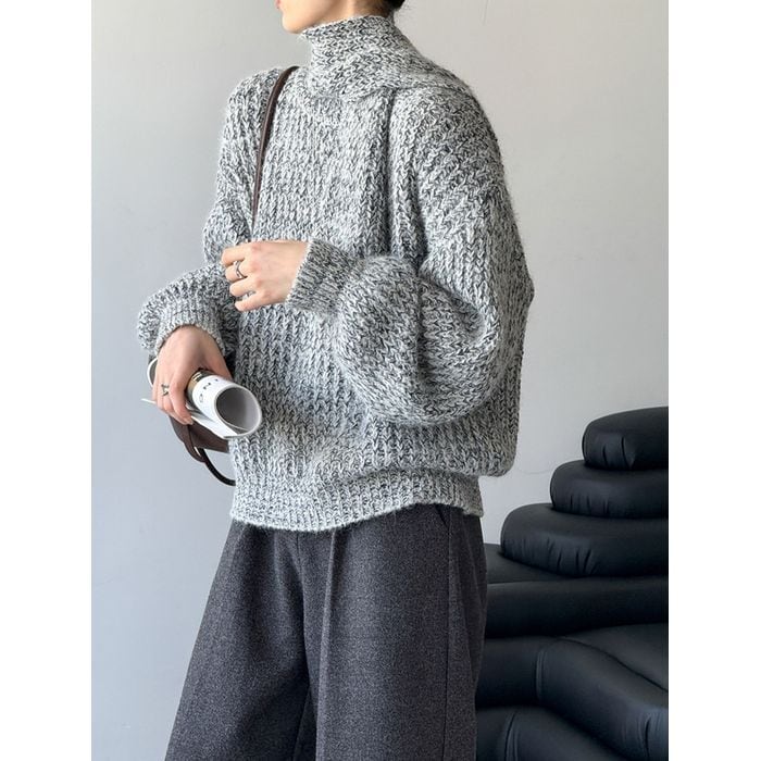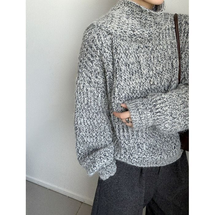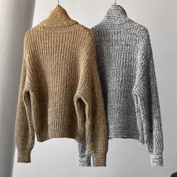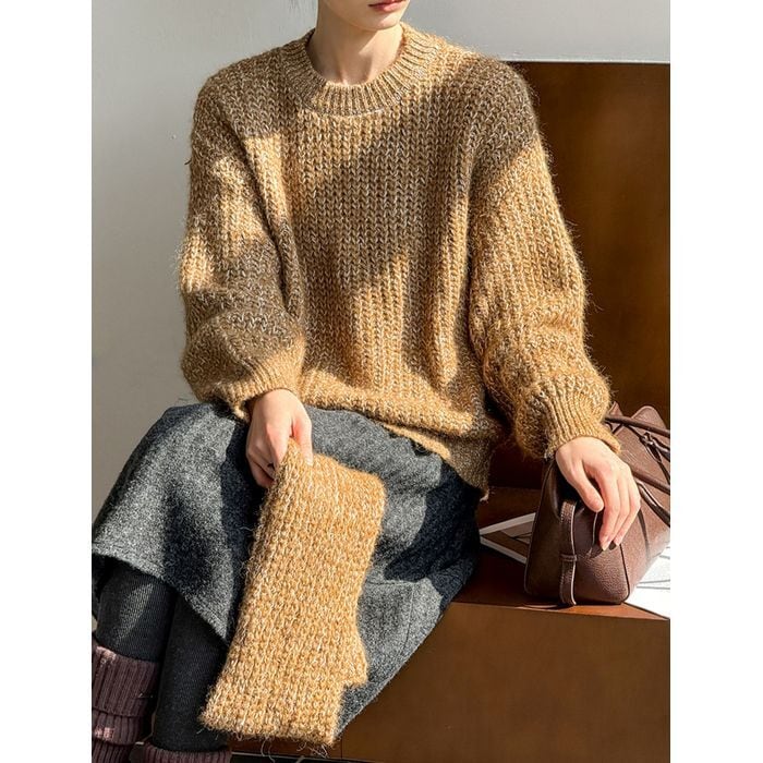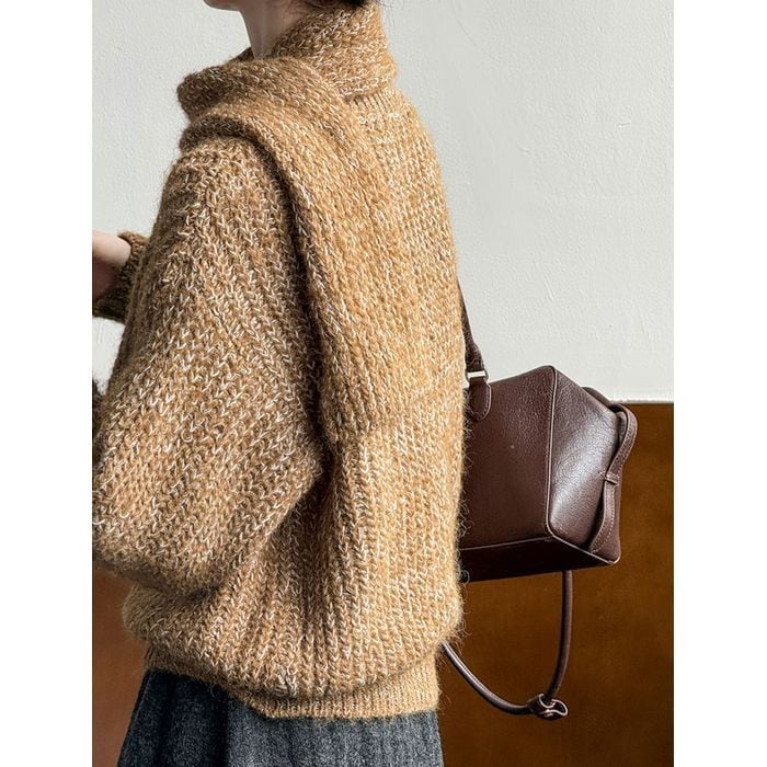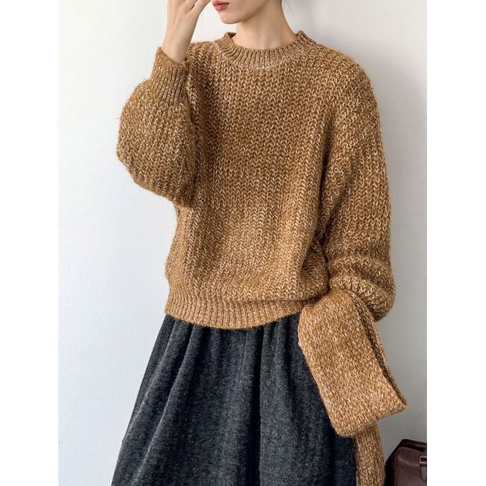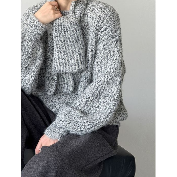 ニュアンスカラーのニットトップスとマフラーのセット。