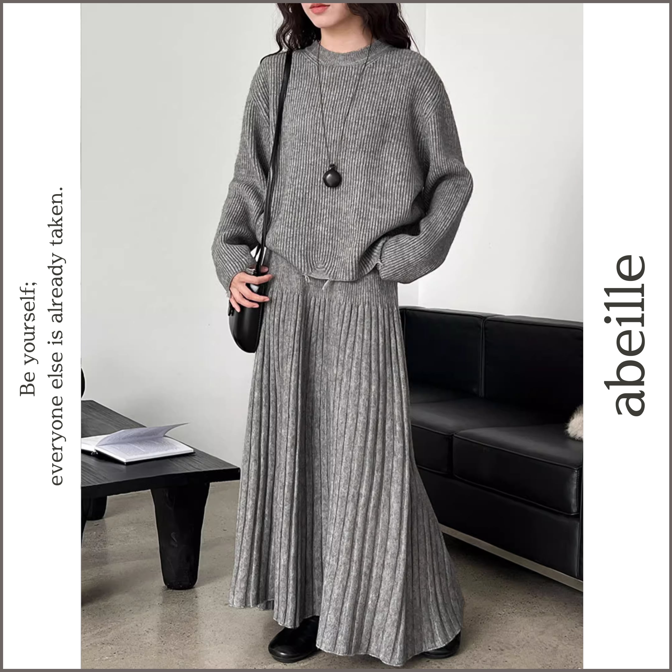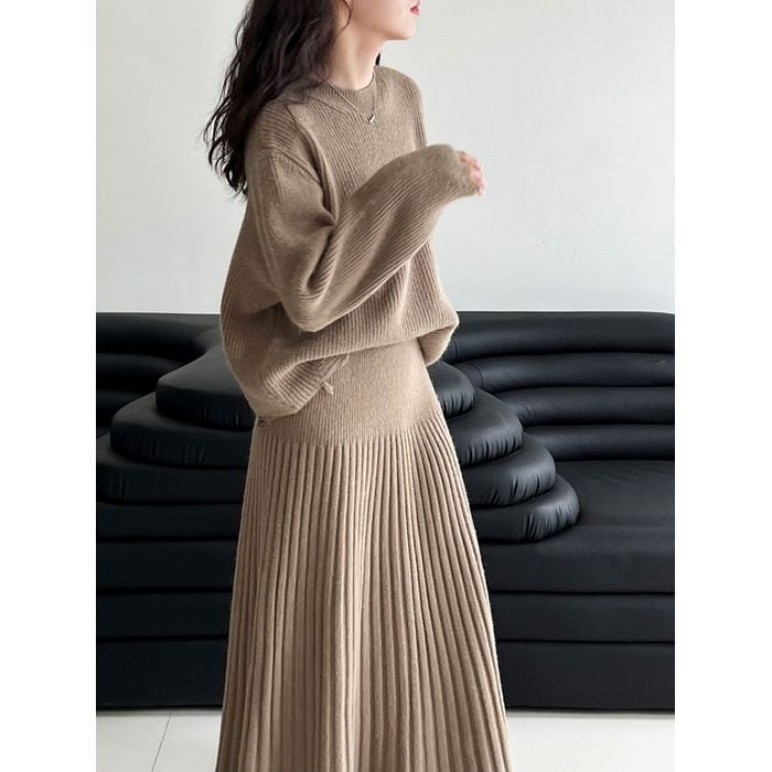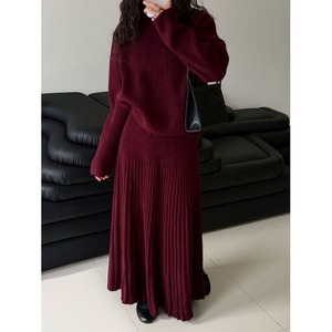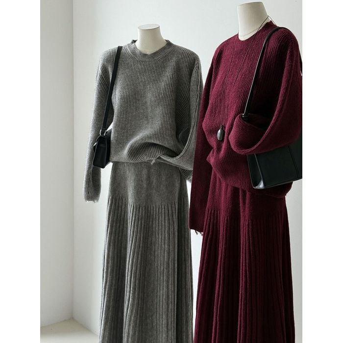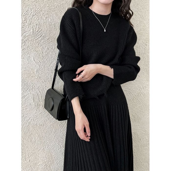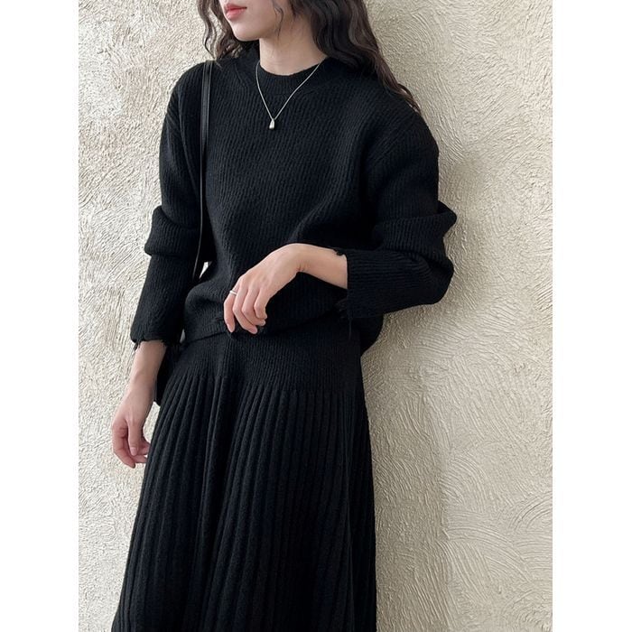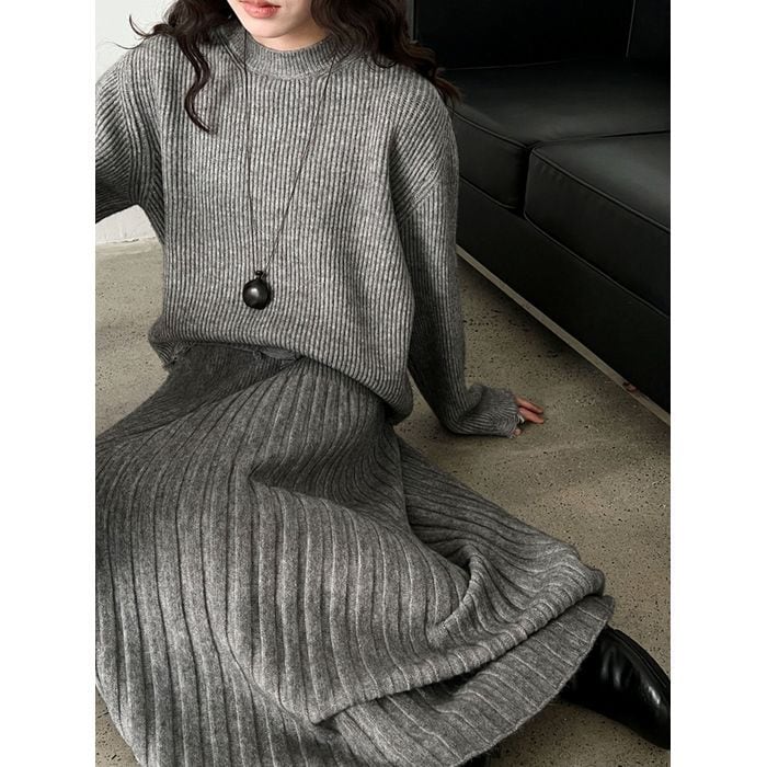 リブニットのトップスとスカートのセットアップ。