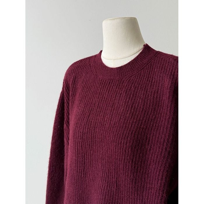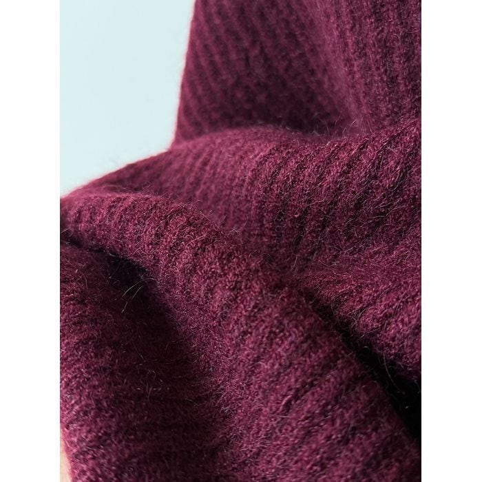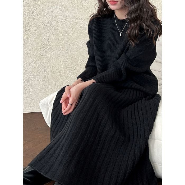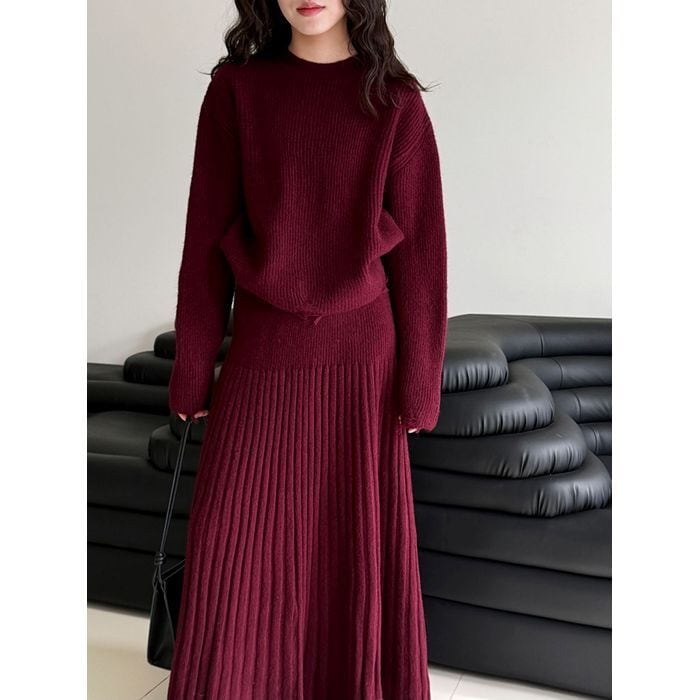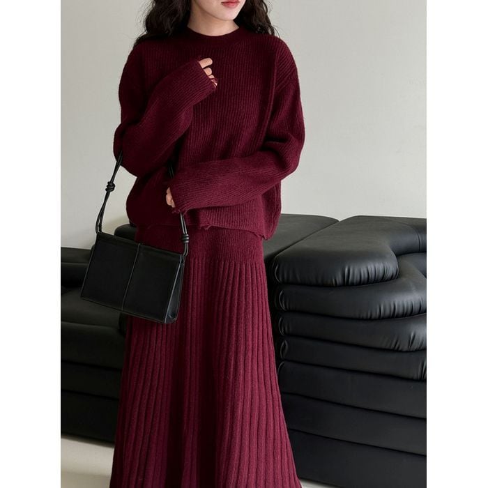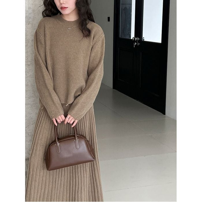 リブニットのトップスとスカートのセットアップ。