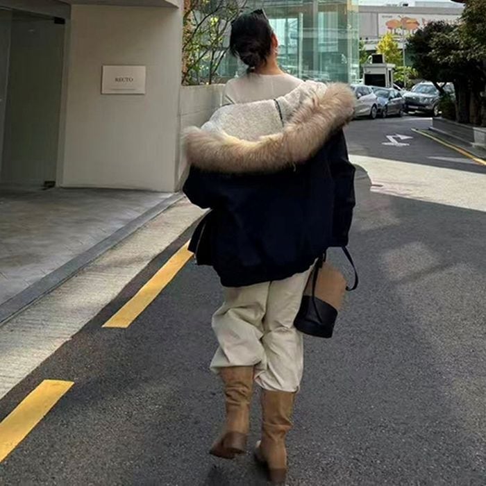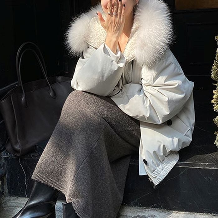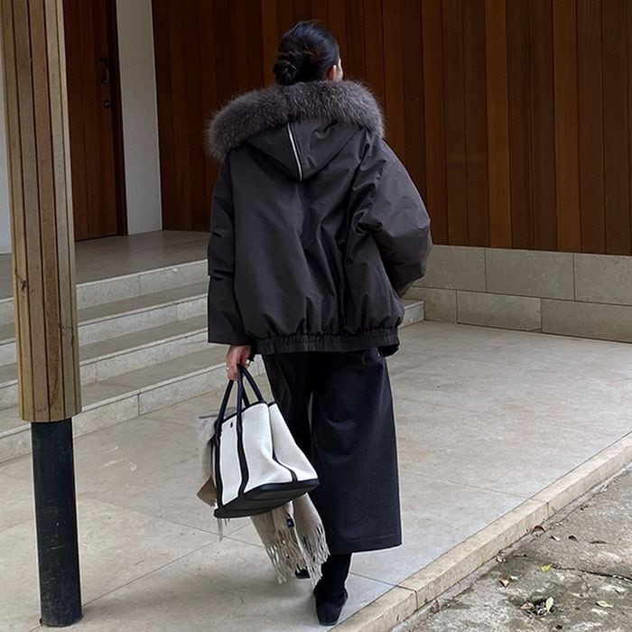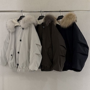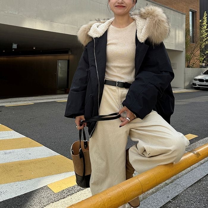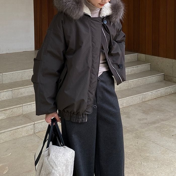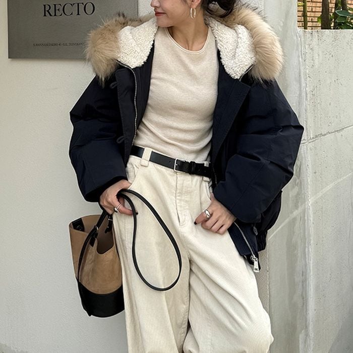 ふんわりとしたファー付きフードが目を引くショート丈アウター。