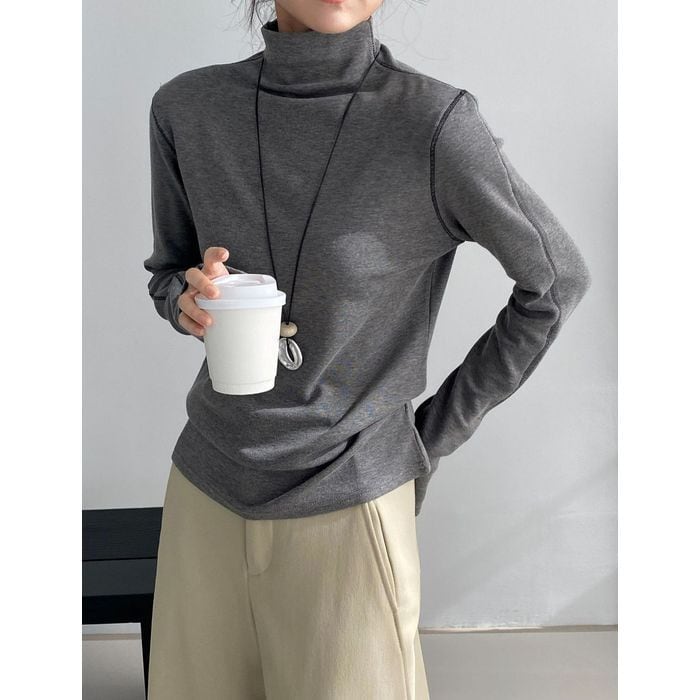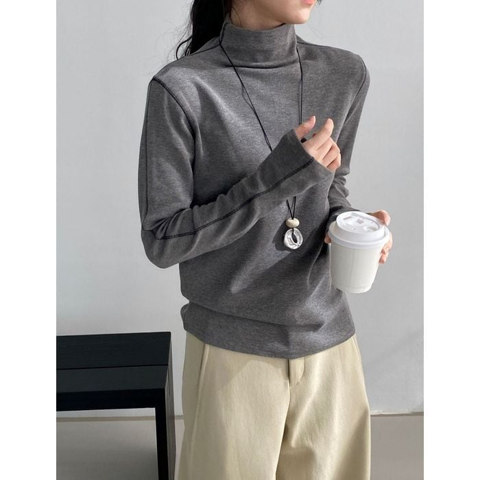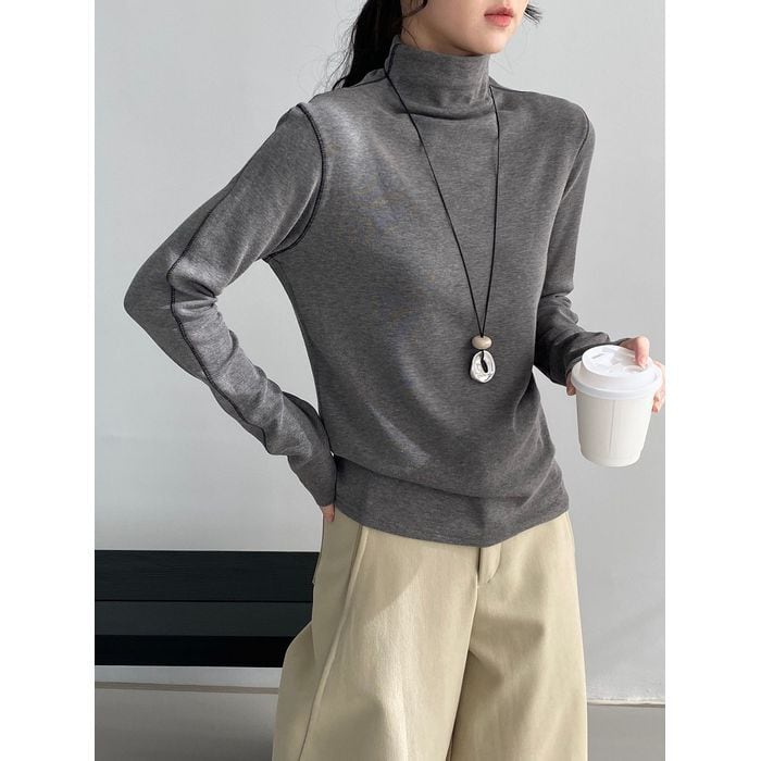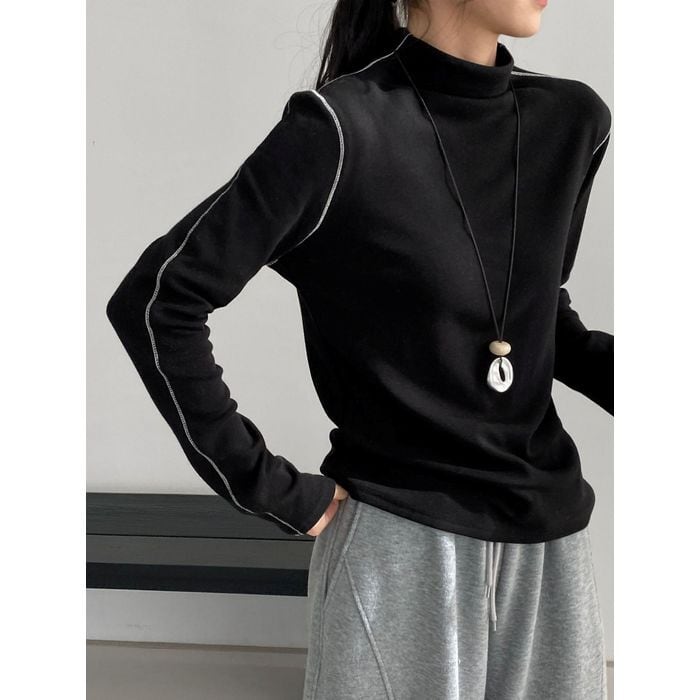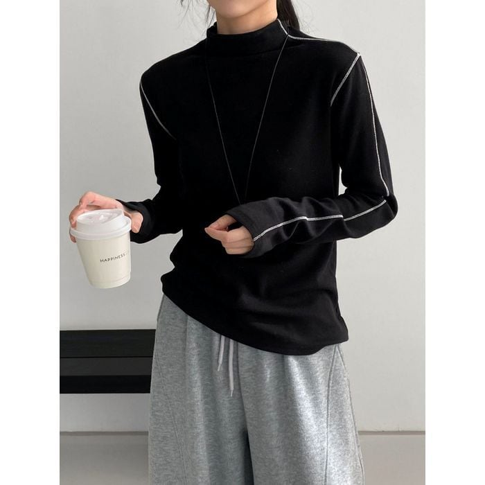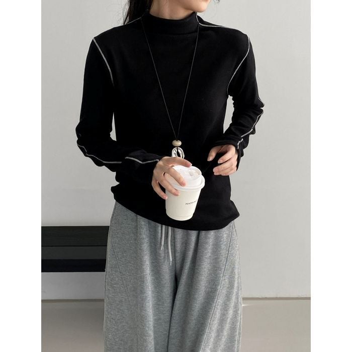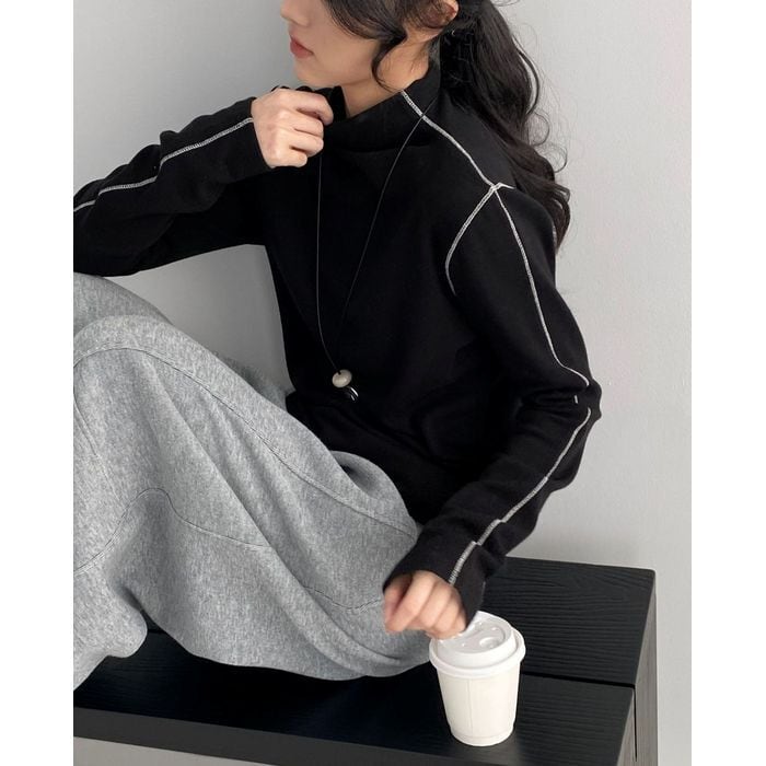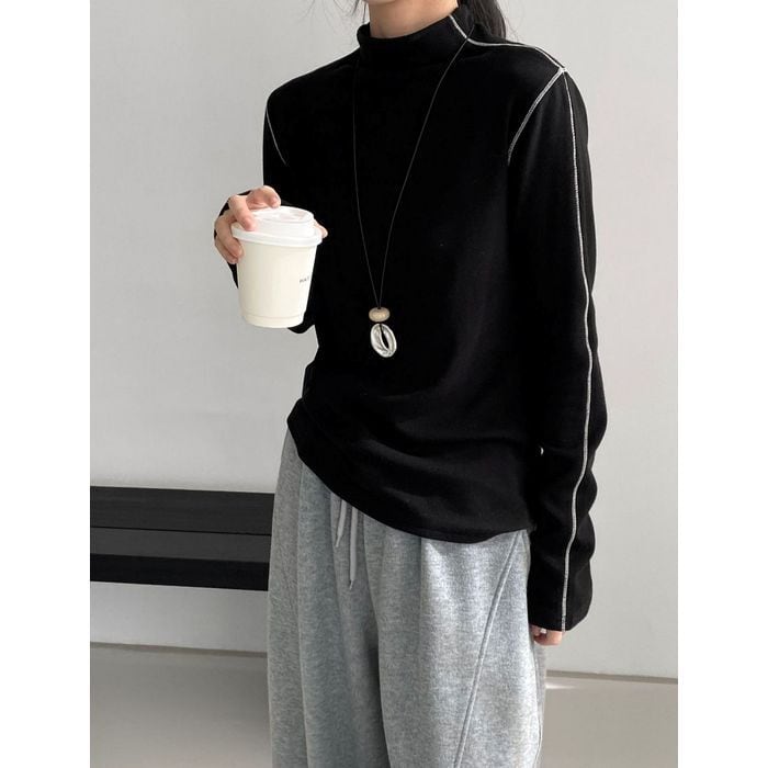 コントラストのあるステッチがアクセントになったハイネックトップス。