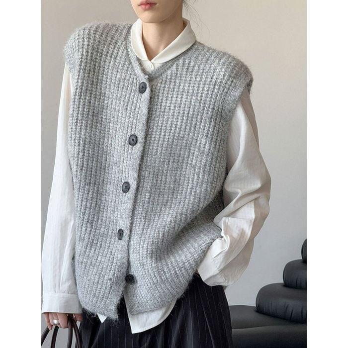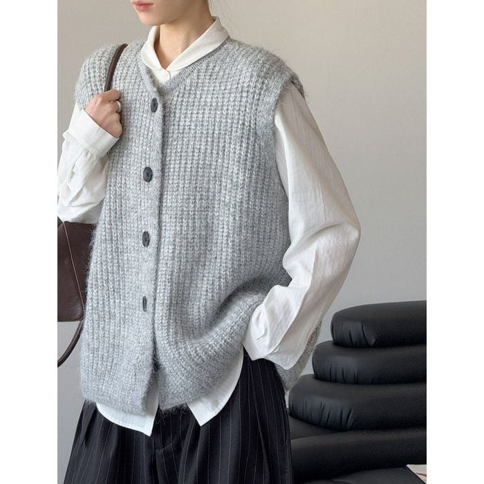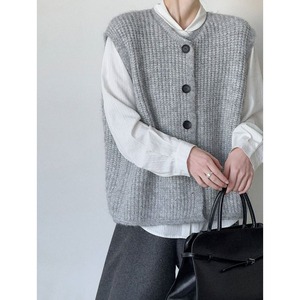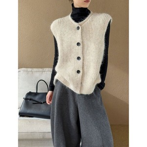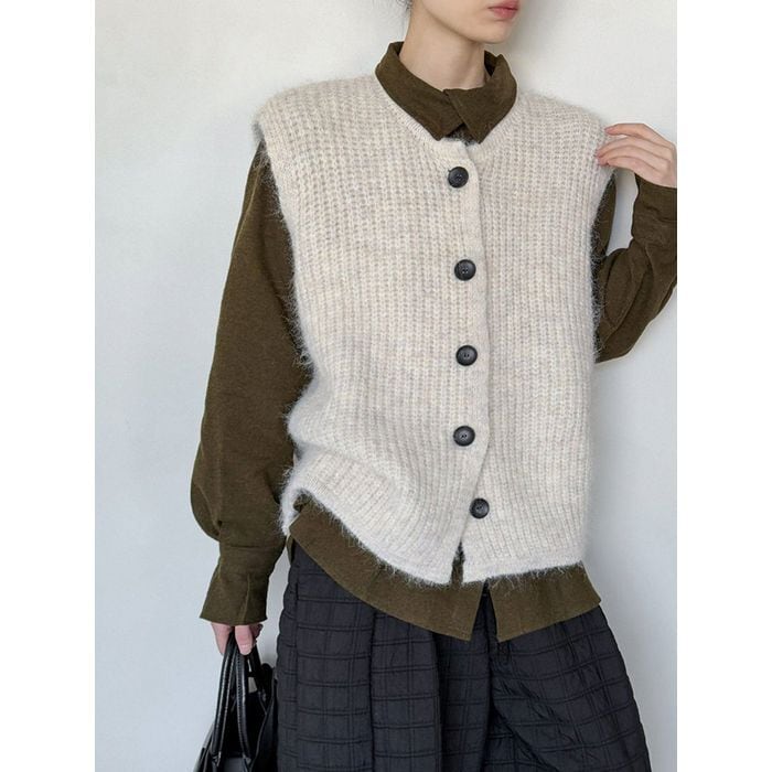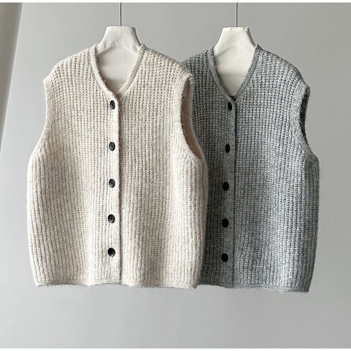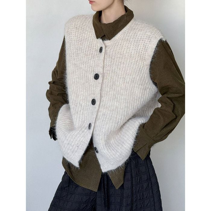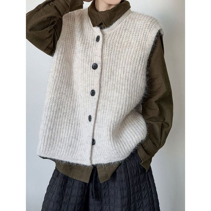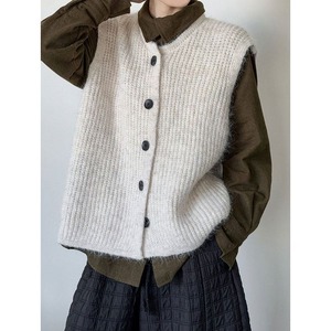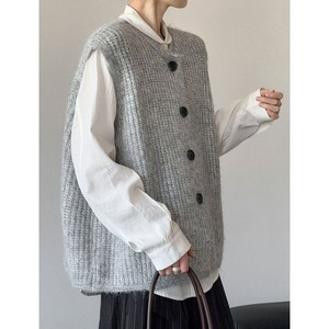 大きめのボタンの付いた、ざっくりとした編地のニットベスト。