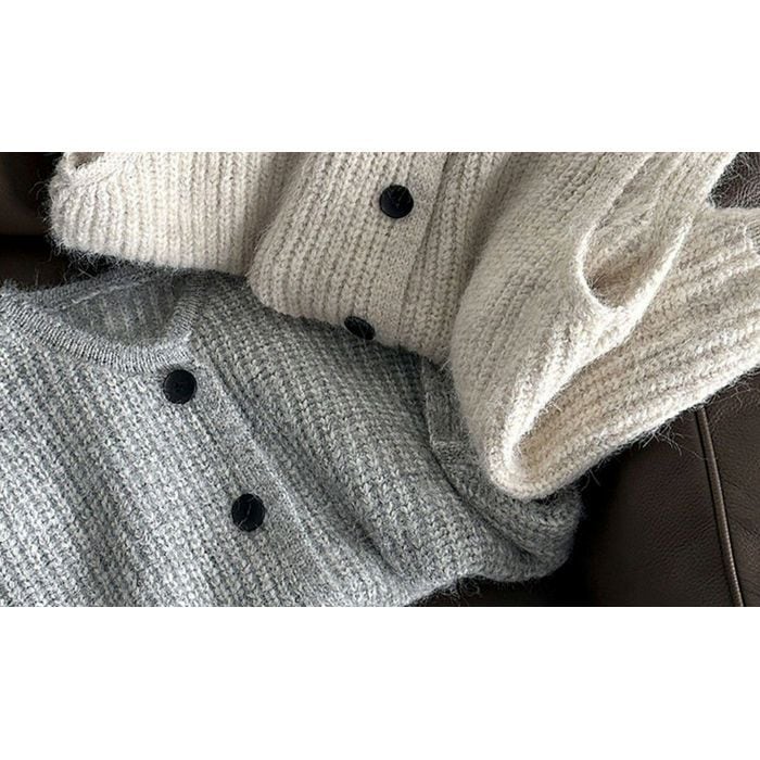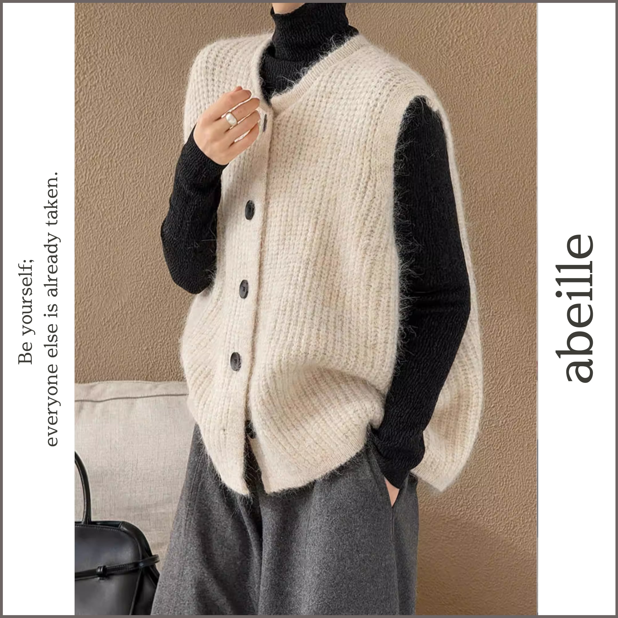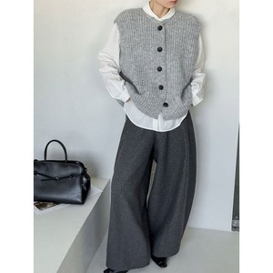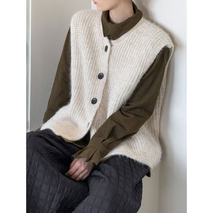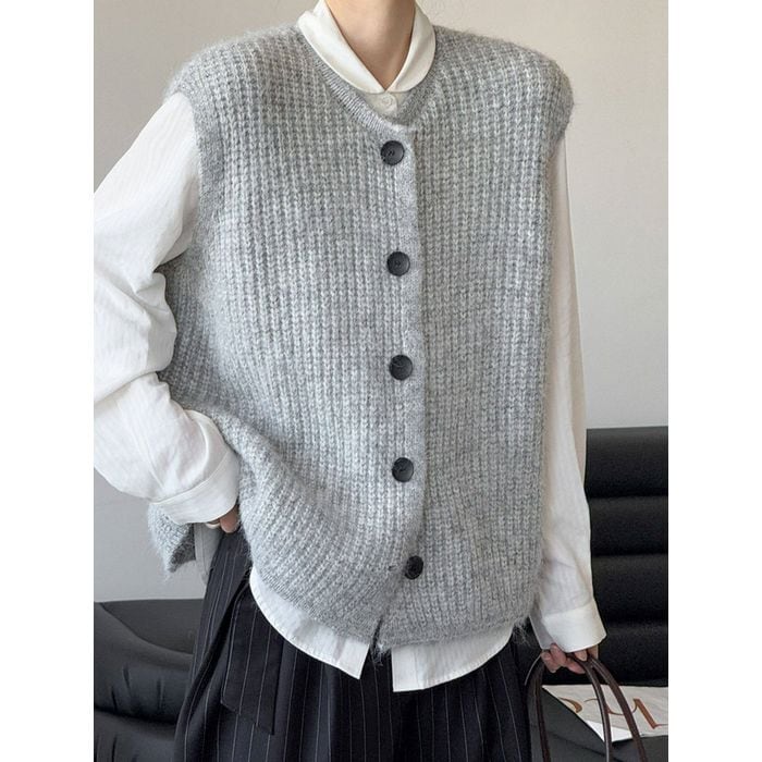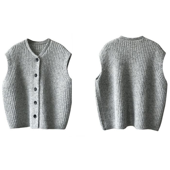 大きめのボタンの付いた、ざっくりとした編地のニットベスト。