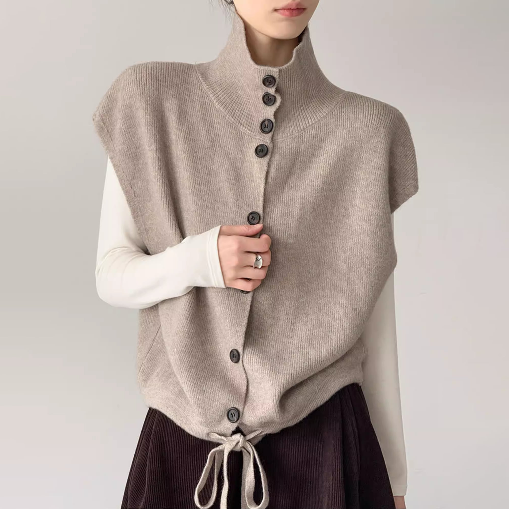 ハイネックと裾のドローストリングが魅力のベスト。