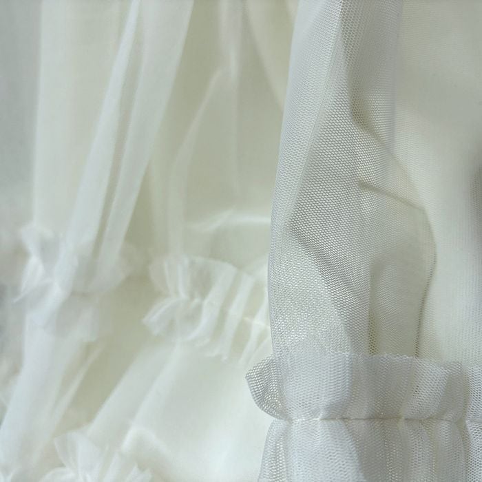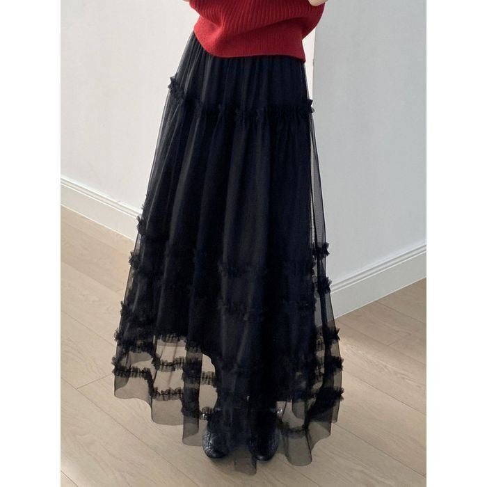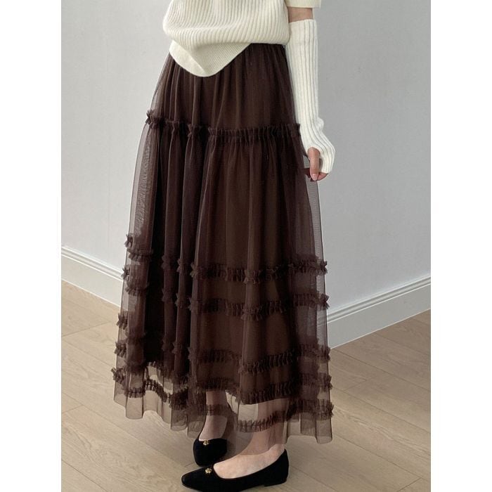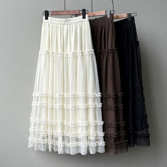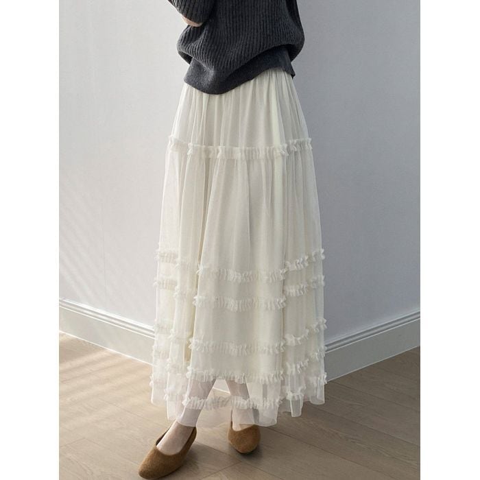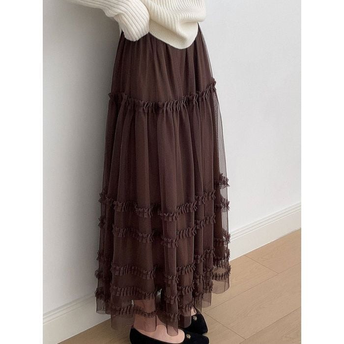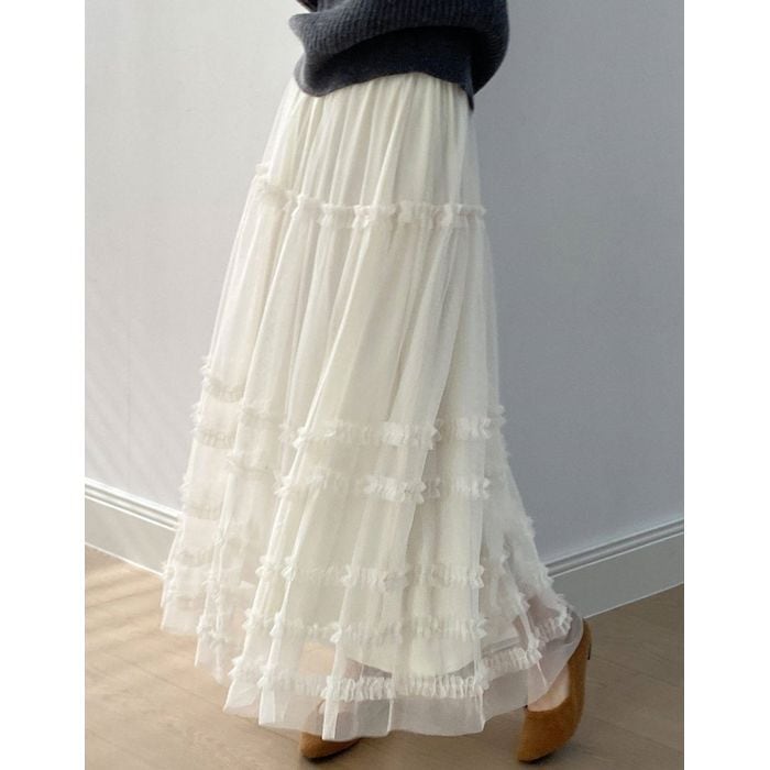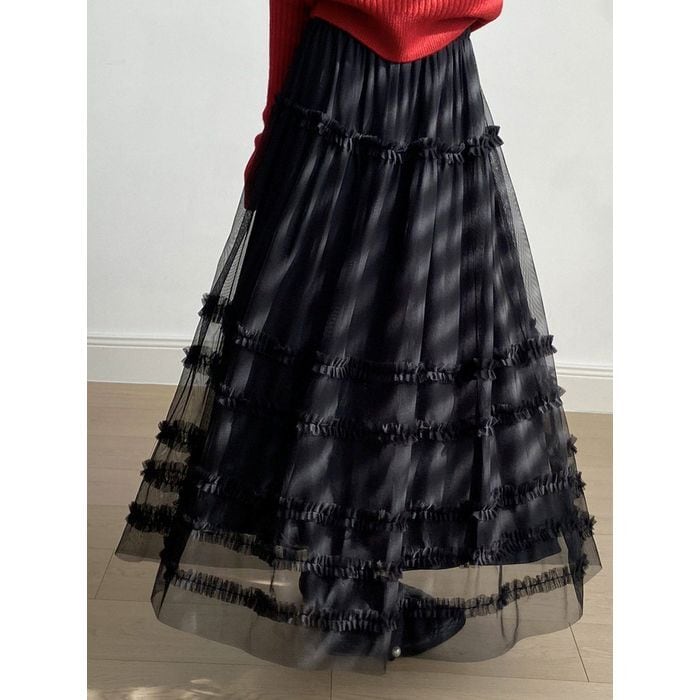 段ごとにあしらわれたフリルが魅力のロングスカート。