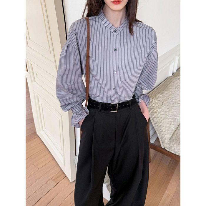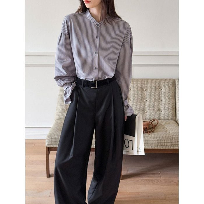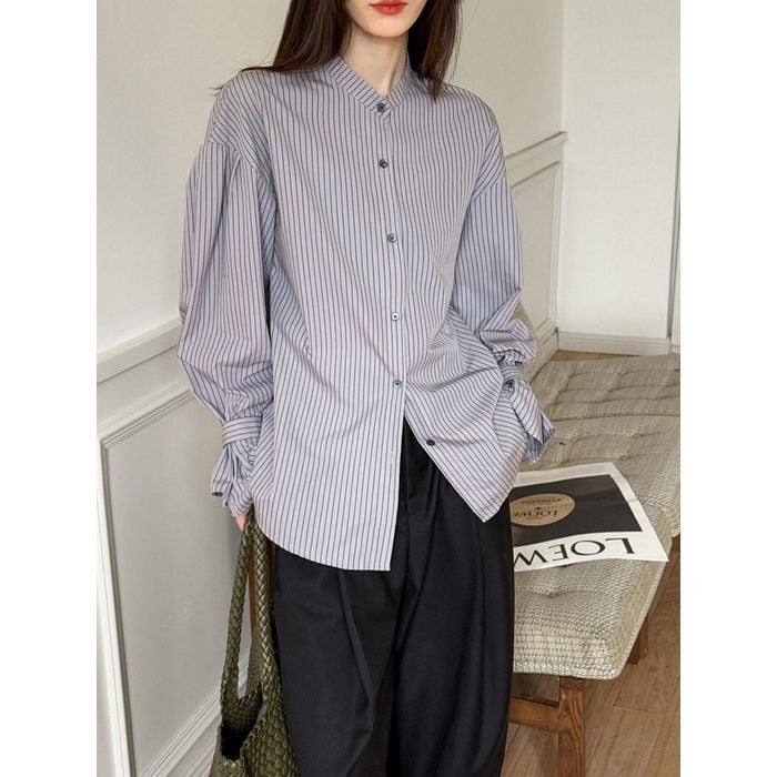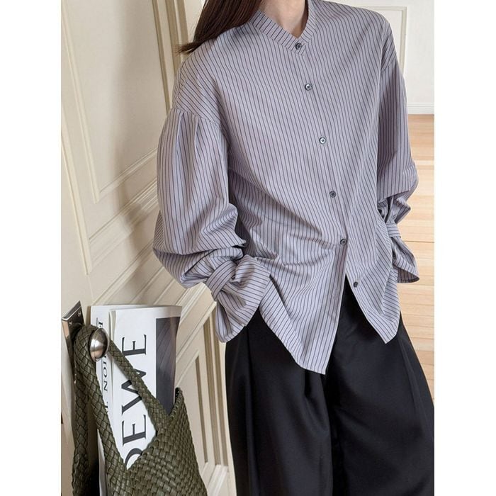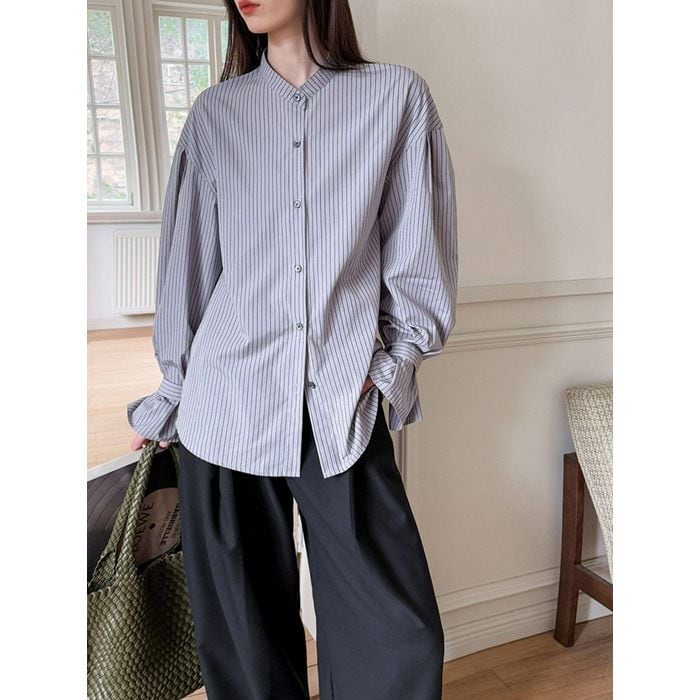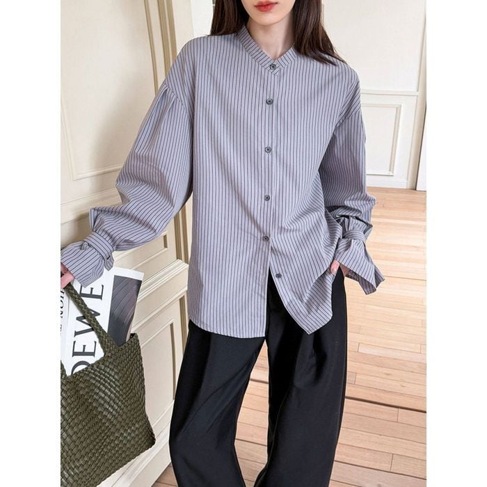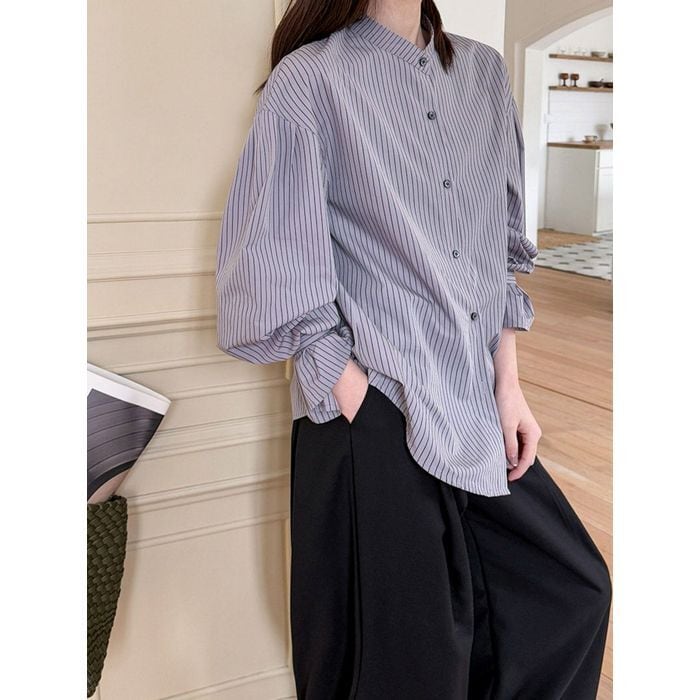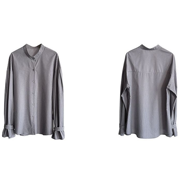 シックなストライプ柄が魅力のスタンドカラーシャツ。