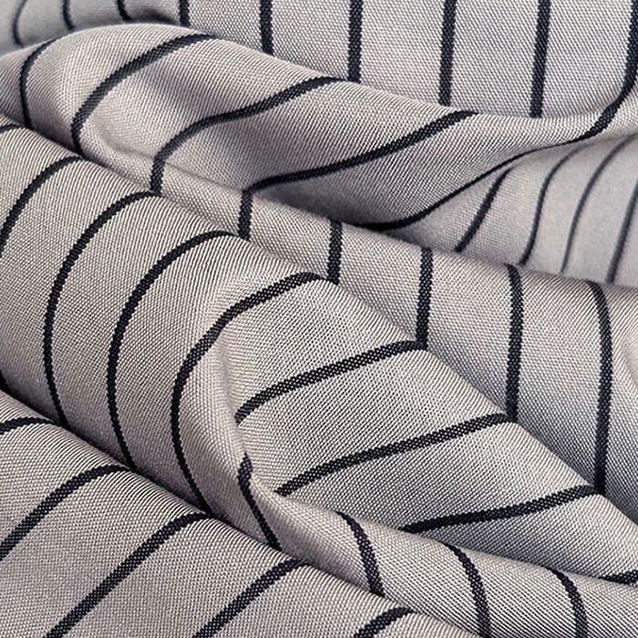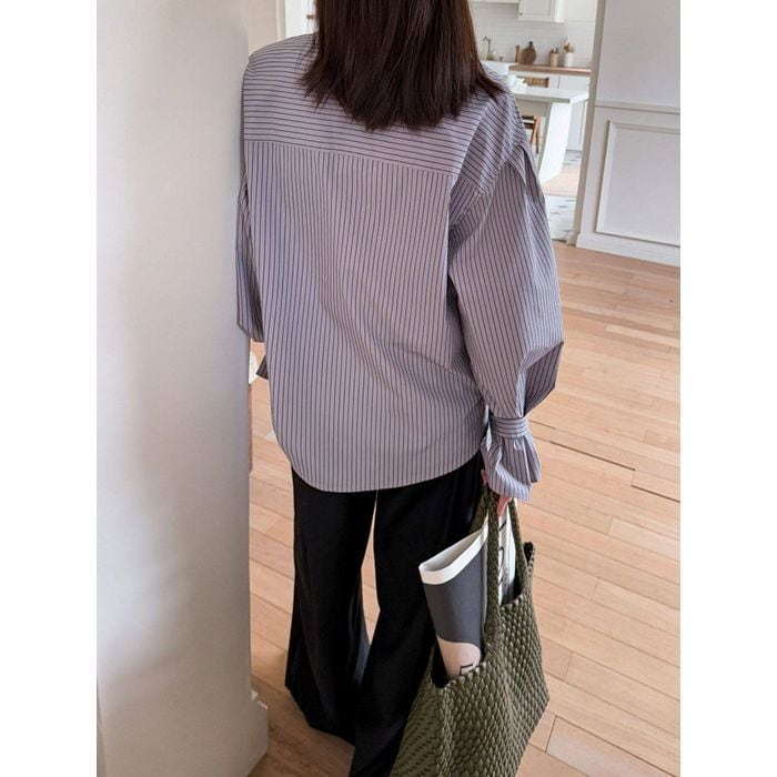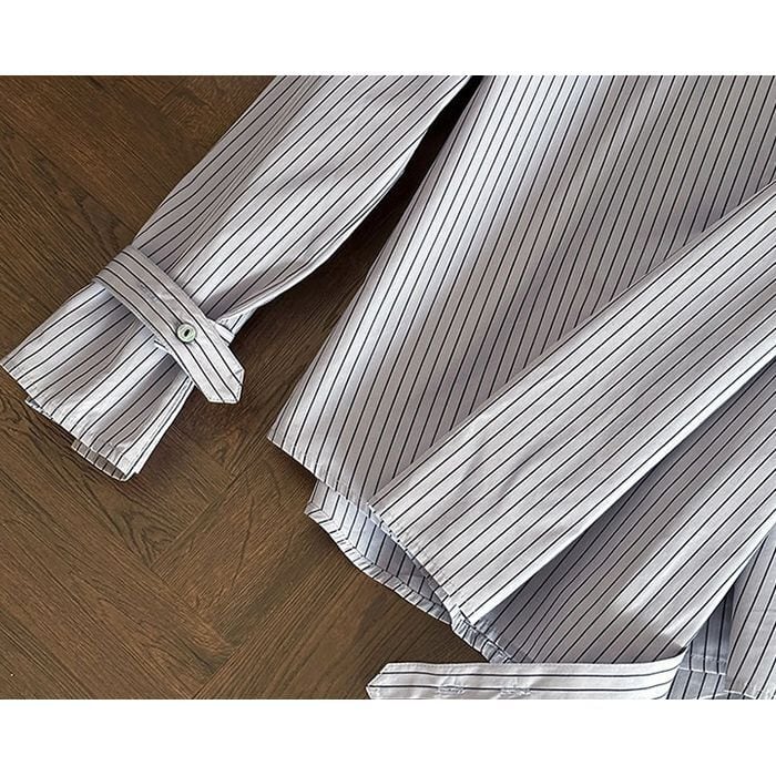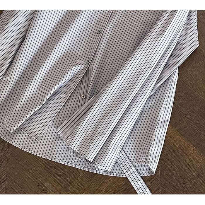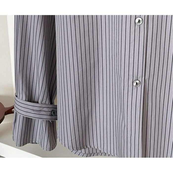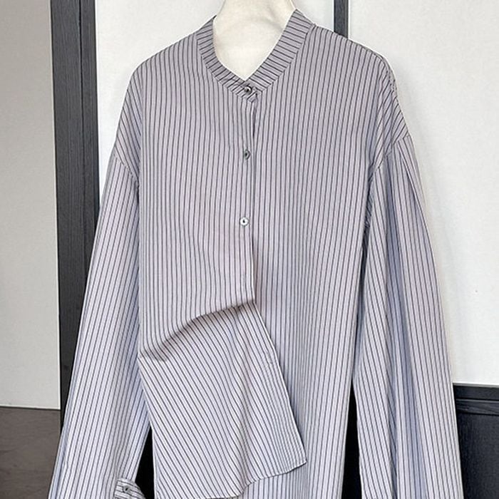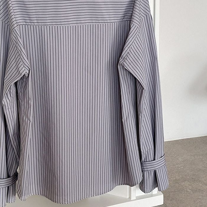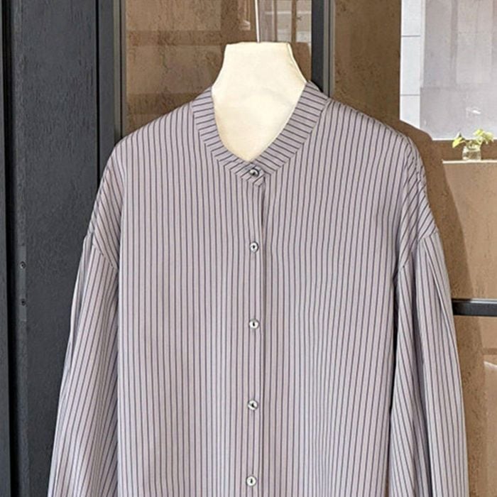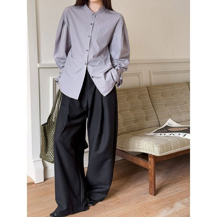 シックなストライプ柄が魅力のスタンドカラーシャツ。