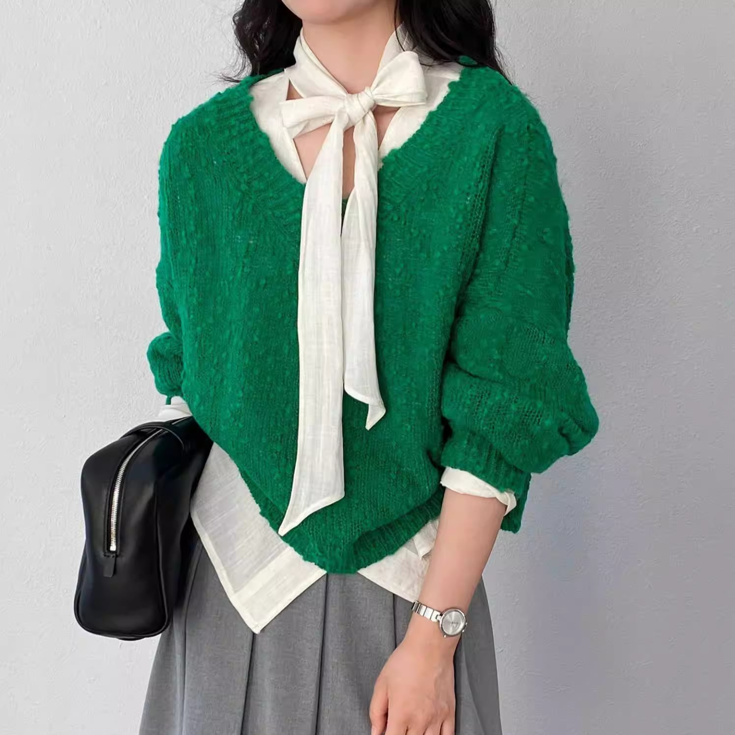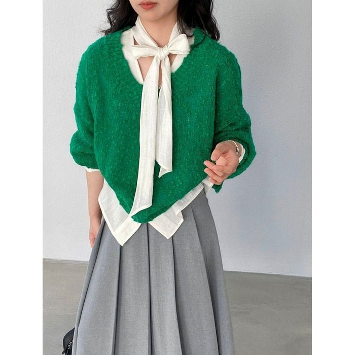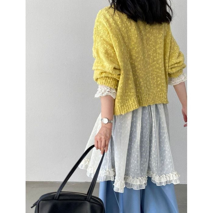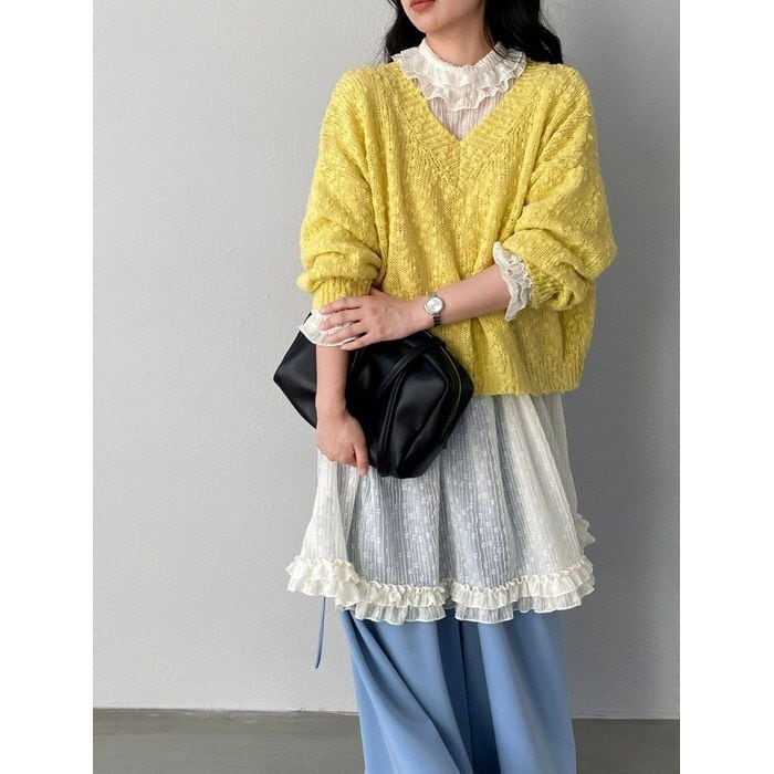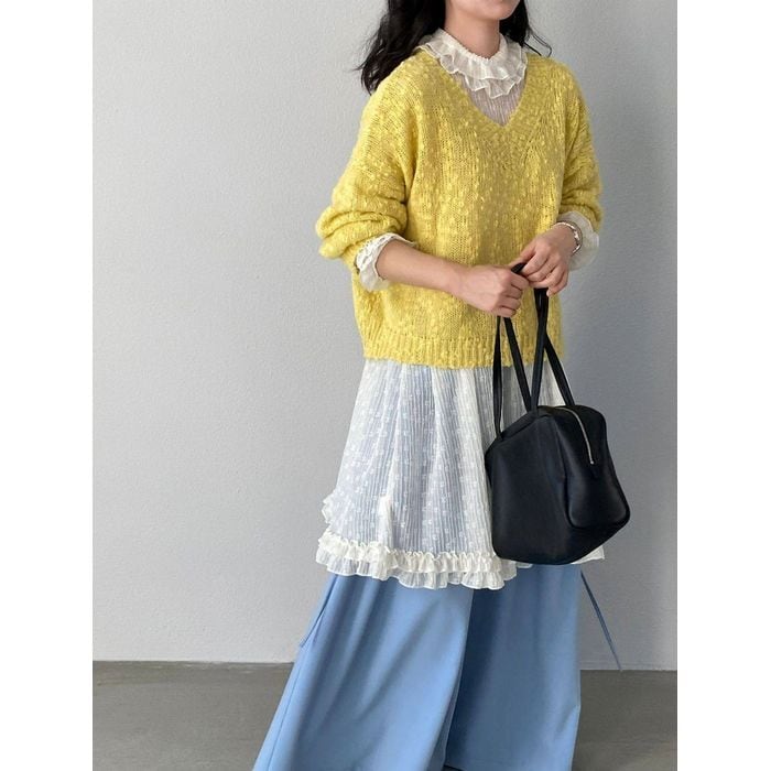 フリルブラウスやワンピースに重ねることで、華やかさと抜け感をプラスします。