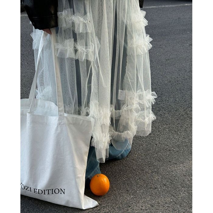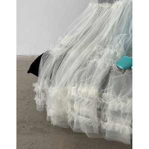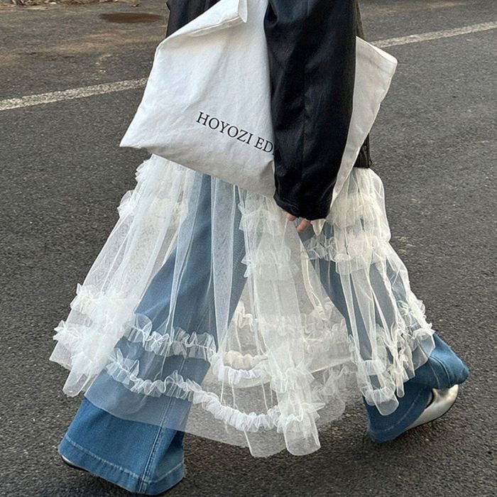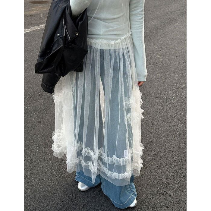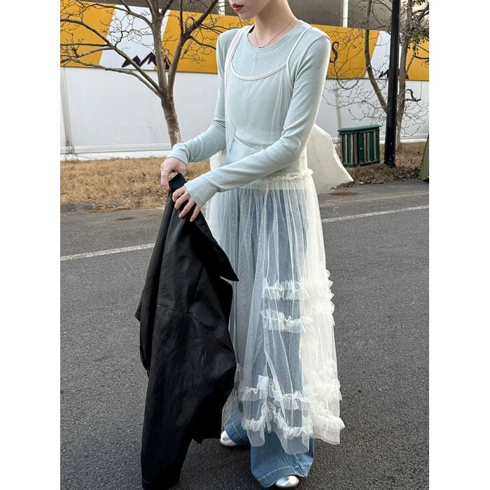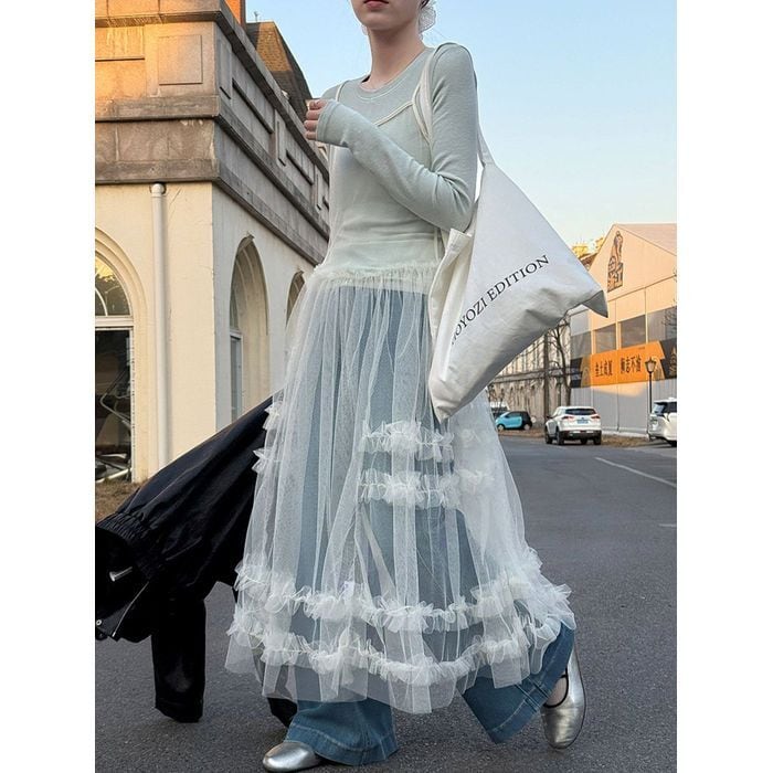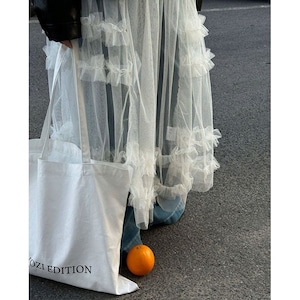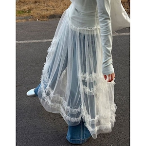 デニムやパンツとのレイヤードで、甘さを抑えた着こなしも楽しめる1枚です。