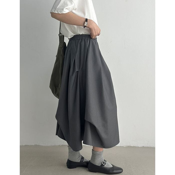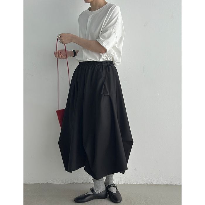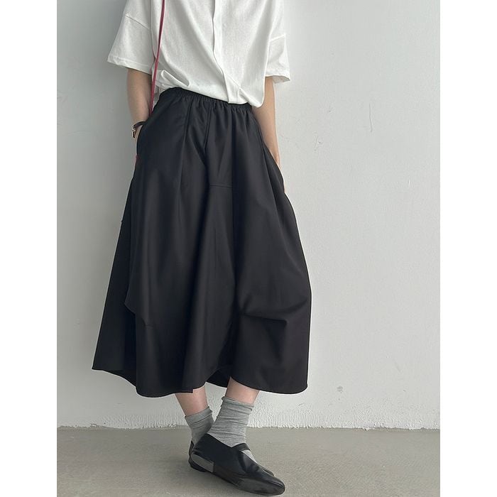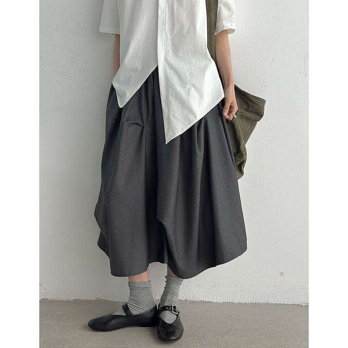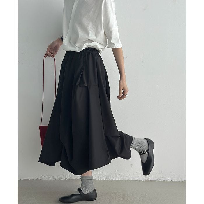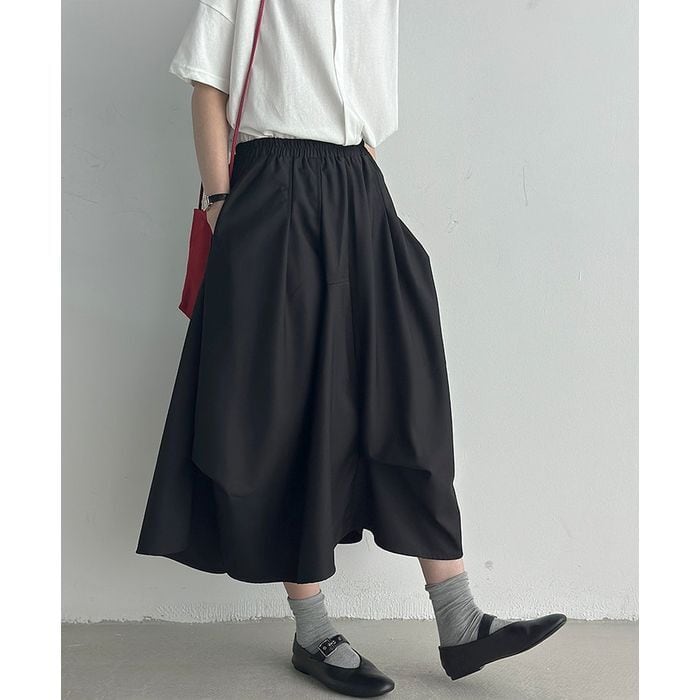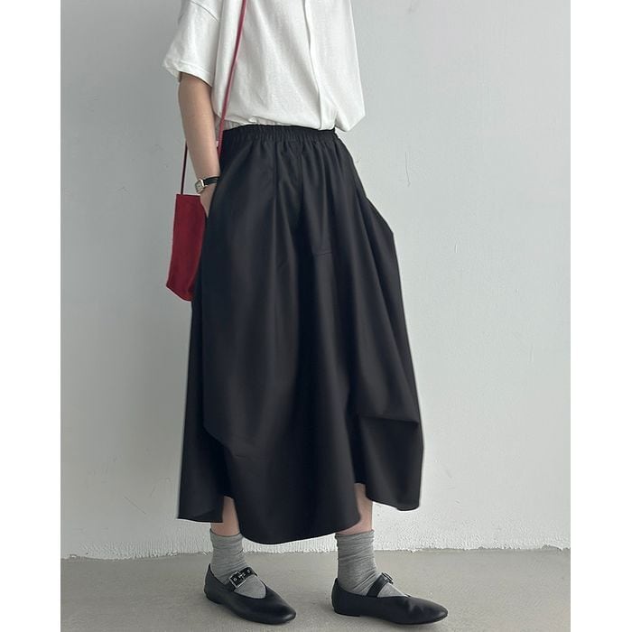 立体的なシルエットが印象的なミモレ丈スカート。