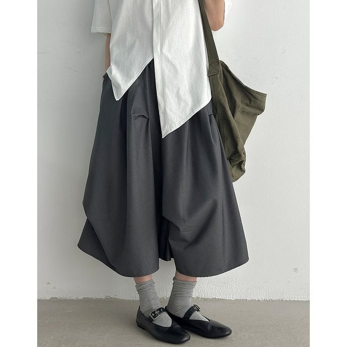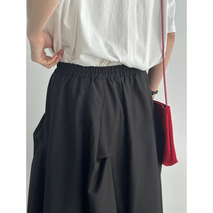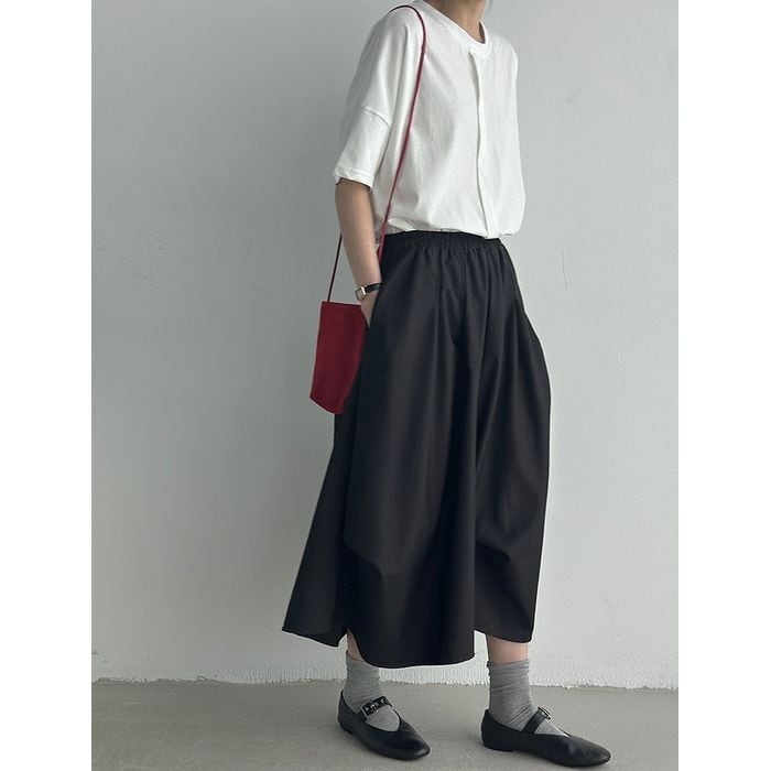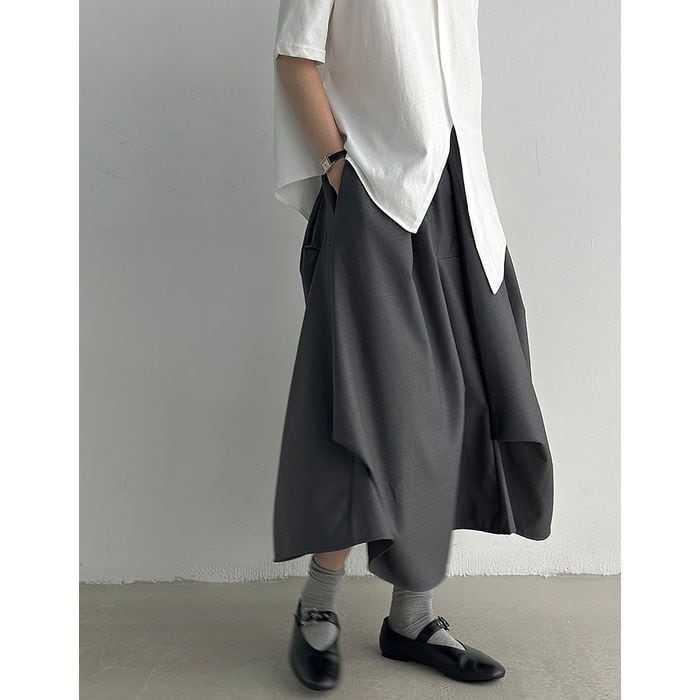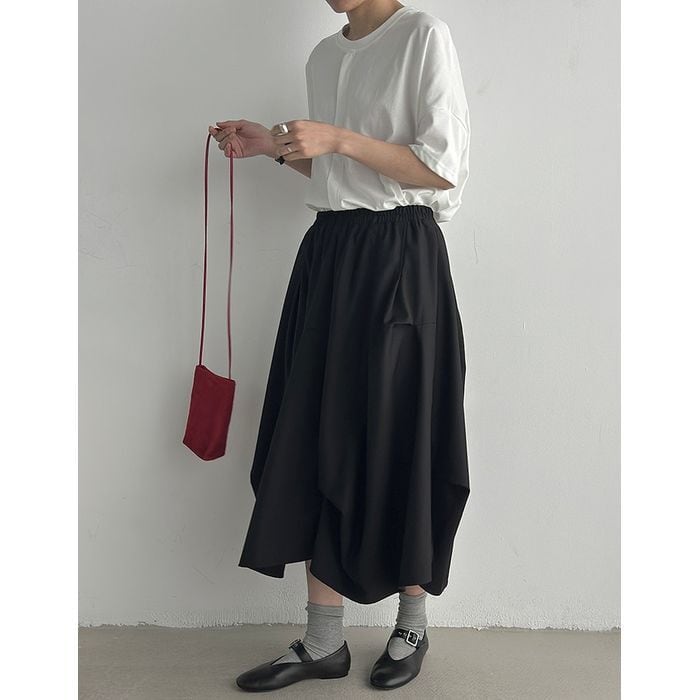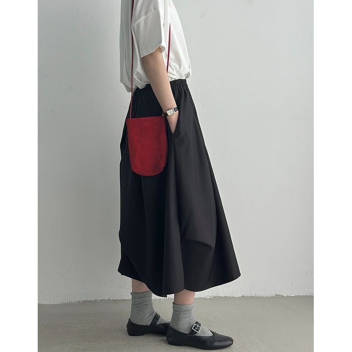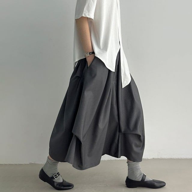 立体的なシルエットが印象的なミモレ丈スカート。