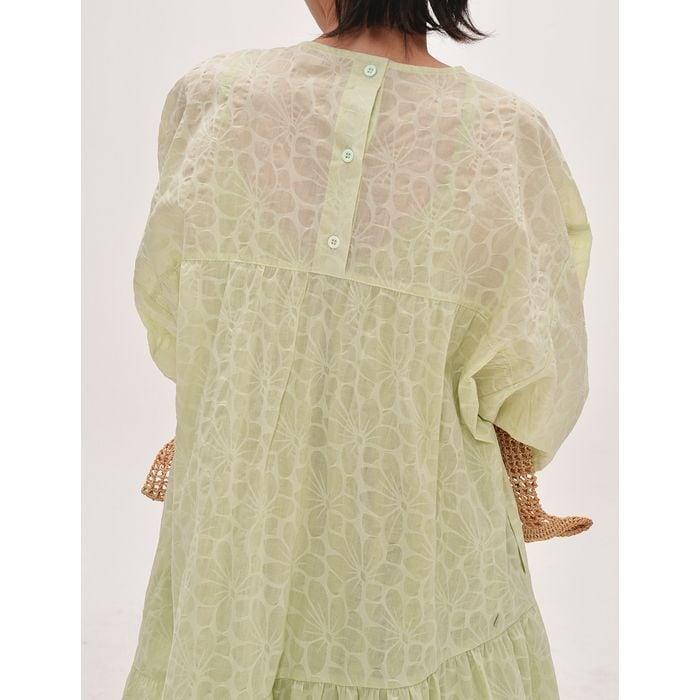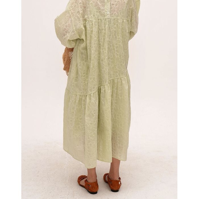 淡いカラーの花柄が魅力のフレアワンピース。